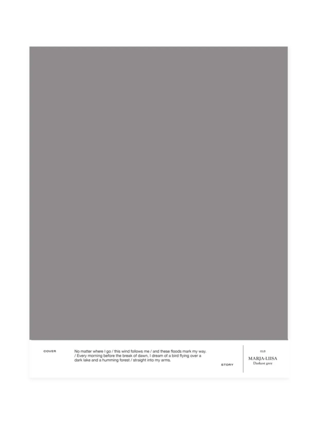 013 MARJA-LIISA on harmoninen tummanharmaa, joka ei muutu hämärässäkään synkäksi. A4-kokoinen ja tarrataustainen värimalli on maalattu aidolla täyshimmeällä Cover Story -maalilla, joten voit olla varma, että sävy on sama kuin varsinaisessa maalissa. Mallitarran voi liimata helposti suoraan maalattavalle pinnalle ja katsoa, miltä sävy näyttää erilaisissa valaistuksissa, sillä valon laatu ja määrä vaikuttavat merkittävästi siihen, miten havaitsemme värin.