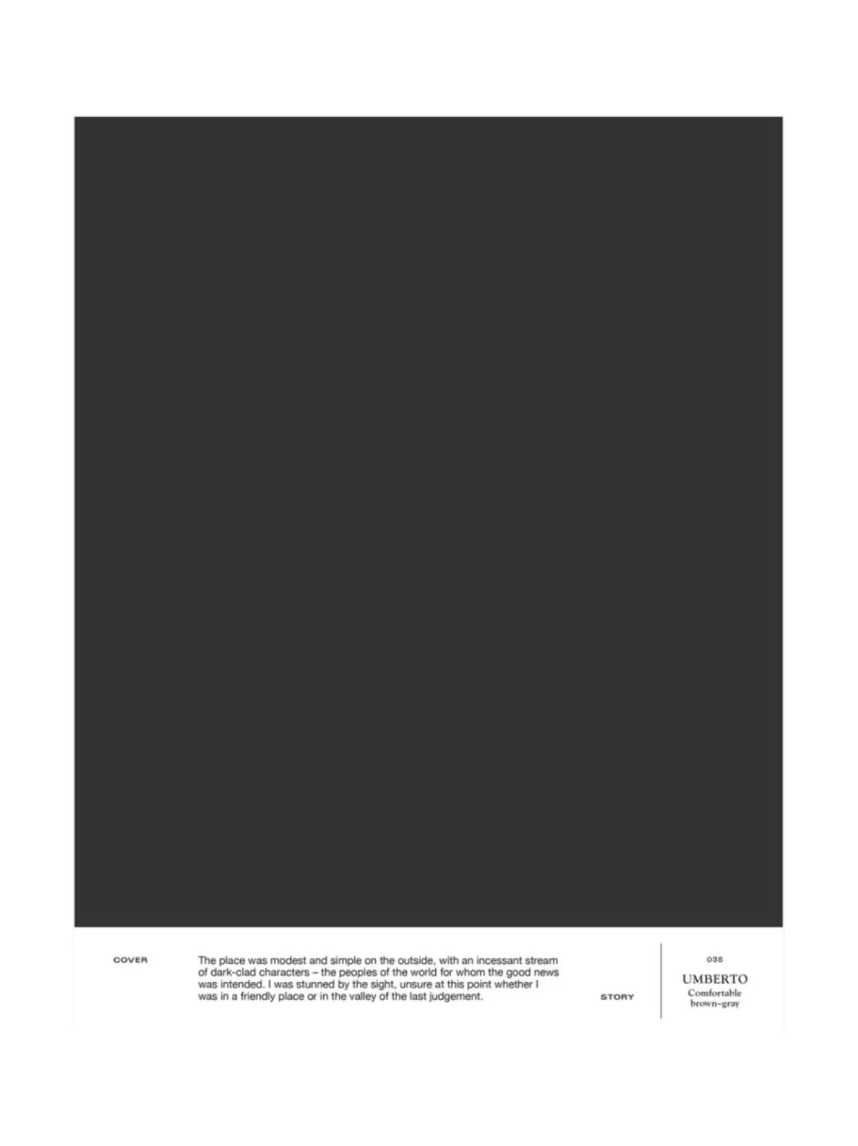035 UMBERTO on hienostuneen tummanruskea maalisävy tummimmillaan. Tilallisesti mustaa lähentelevä tunnelmallinen tumma sävy ikään kuin häivyttää tilan kulmat ja reunat ja käärii pehmeästi sisälleen. Turvallinen tumma on suunnitteija Ulla Koskisen suunnittelema. A4-kokoinen ja tarrataustainen värimalli on maalattu aidolla täyshimmeällä Cover Story -maalilla, joten voit olla varma, että sävy on sama kuin varsinaisessa maalissa. Mallitarran voi liimata helposti suoraan maalattavalle pinnalle ja katsoa, miltä sävy näyttää erilaisissa valaistuksissa, sillä valon laatu ja määrä vaikuttavat merkittävästi siihen, miten havaitsemme värin.