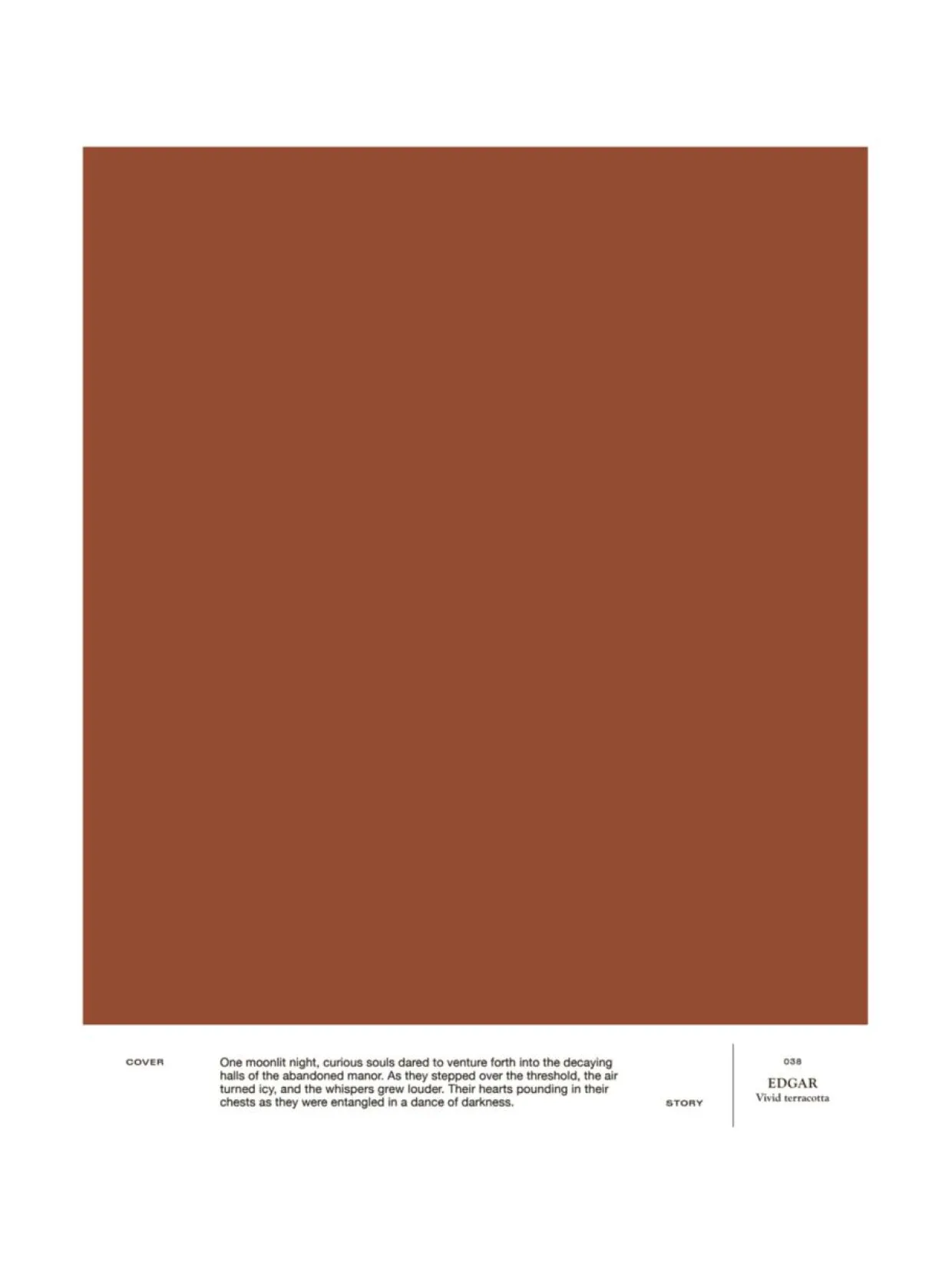 038 EDGAR on ajaton poltetun saven sävy. Klassinen ruukkusävy tuo sielua ja lämpöä sisustukseen. Täyteläinen terrakotta loistaa luonnonvalon mukana ja sammuu pehmeästi varjon seurassa. A4-kokoinen ja tarrataustainen värimalli on maalattu aidolla täyshimmeällä Cover Story -maalilla, joten voit olla varma, että sävy on sama kuin varsinaisessa maalissa. Mallitarran voi liimata helposti suoraan maalattavalle pinnalle ja katsoa, miltä sävy näyttää erilaisissa valaistuksissa, sillä valon laatu ja määrä vaikuttavat merkittävästi siihen, miten havaitsemme värin.