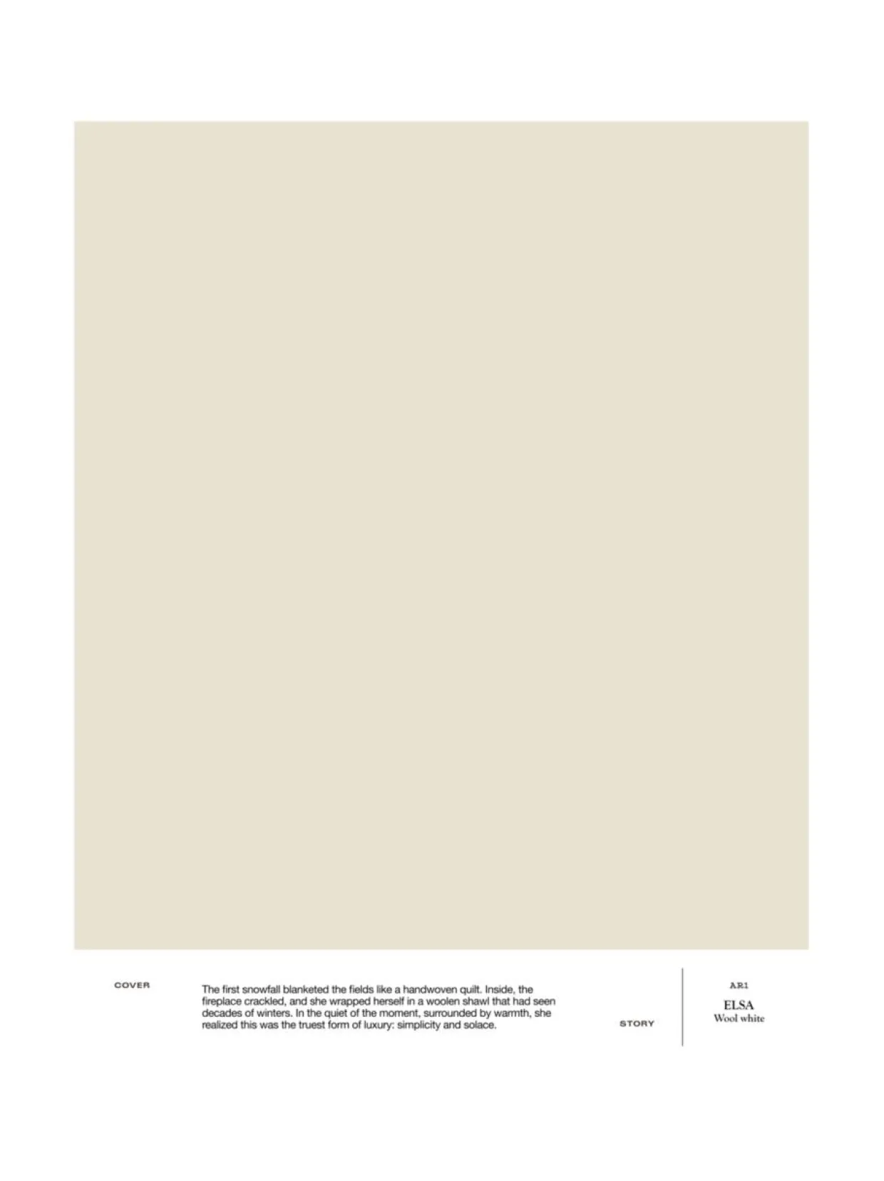 AR1 ELSA on lämmin ja ajaton villanvalkoinen maalisävy, joka kietoo tilan pehmeyteen. Pehmeä villanvalkoinen on erinomainen sävyvalinta lähes mihin tahansa tilaan, joka kaipaa valoa ja kotoisaa tunnelmaa.Sävy on osa Cover Story x Artek Helsinki -sisämaalikokoelmaa. A4-kokoinen tarrataustainen värimalli on maalattu aidolla täyshimmeällä Cover Story -maalilla, joten voit olla varma, että sävy on sama kuin varsinaisessa maalissa. Mallitarran voi liimata helposti suoraan maalattavalle pinnalle ja katsoa, miltä sävy näyttää erilaisissa valaistuksissa – valon laatu ja määrä vaikuttavat merkittävästi siihen, miten havaitsemme värin.