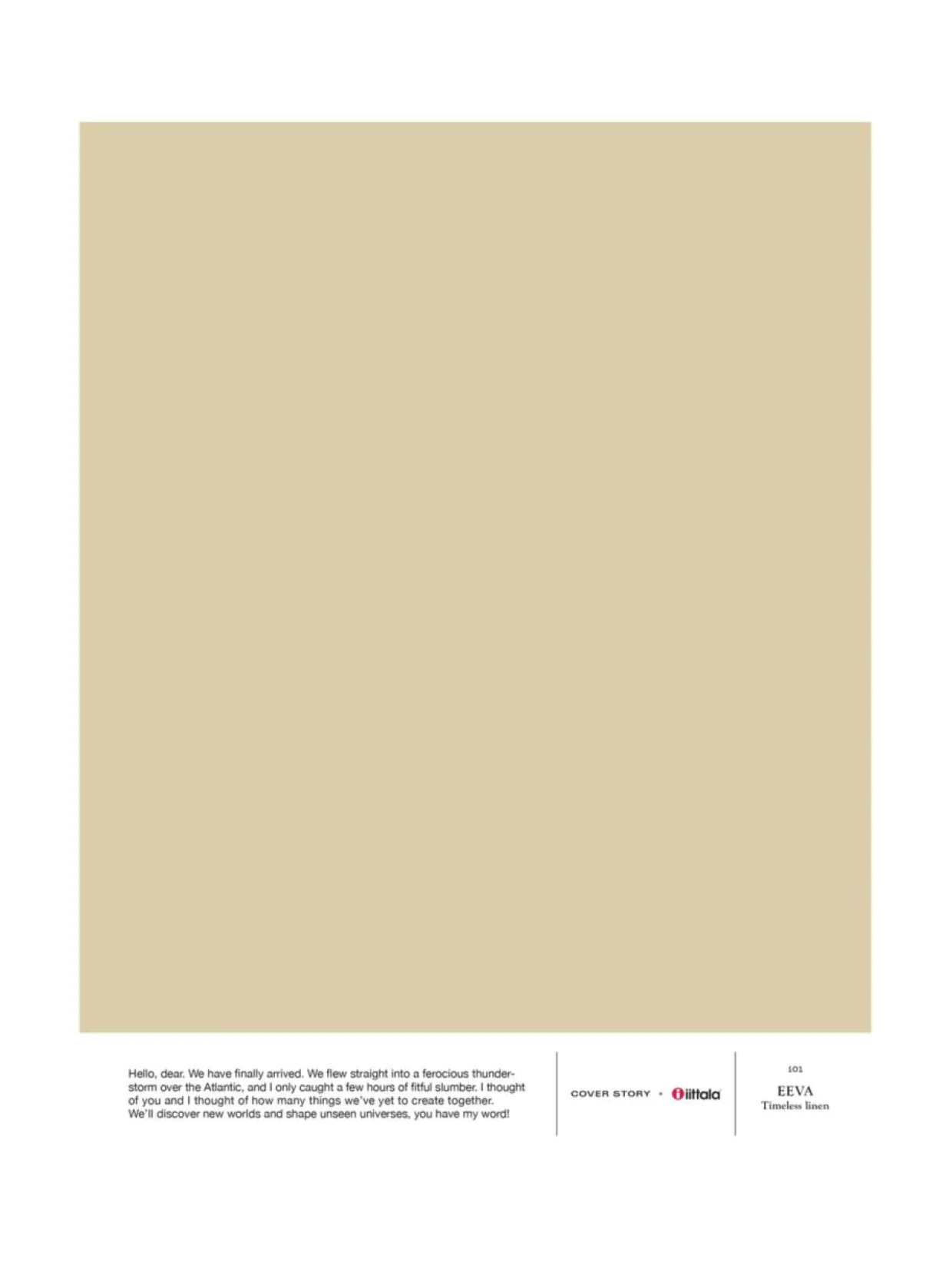 i01 EEVA on lämmin vaalea pellava maalisävy. Ajaton beigen sävy on raikas, kirkas ja ikuinen valinta kodin sävymaailmaan. Sävy on osa Cover Story x Iittala -tilavärikokoelmaa. Sisätilojen pinnoilla pellavainen maalisävy on kevyt sekä tasapainottava ja se sitoo tilan eheäksi kokonaisuudeksi. A4-kokoinen tarrataustainen värimalli on maalattu aidolla täyshimmeällä Cover Story -maalilla, joten voit olla varma, että sävy on sama kuin varsinaisessa maalissa. Mallitarran voi liimata helposti suoraan maalattavalle pinnalle ja katsoa, miltä sävy näyttää erilaisissa valaistuksissa – valon laatu ja määrä vaikuttavat merkittävästi siihen, miten havaitsemme värin.