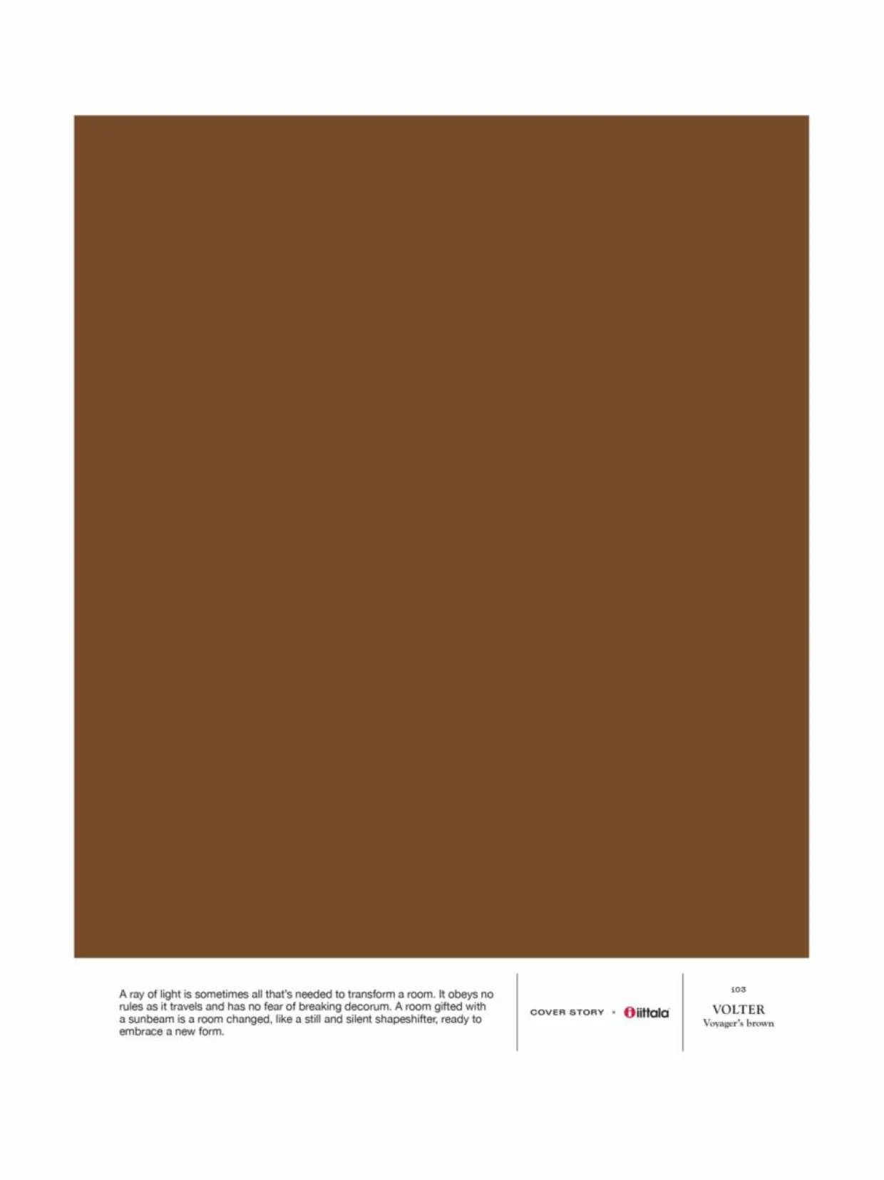 i03 VOLTER on keskiruskea maalisävy lämpimimmillään. Luonnonläheinen ruskea on rauhoittava ja monikäyttöinen sävy kodin sisustukseen. Tasapainoinen ja luonnollinen lämmin ruskea on helppo yhdistää osaksi kodin sisustusta, sillä se hurmaa niin puupintojen, luonnonmateriaalien kuin vaikka rottingin tai siisalin rinnalla. i03 VOLTER – Voyager’s brown antaa seinille ja katolle pehmeästi valoa heijastavan mattapinnan. Sävy on osa Cover Story x Iittala -tilavärikokoelmaa. A4-kokoinen tarrataustainen värimalli on maalattu aidolla täyshimmeällä Cover Story -maalilla, joten voit olla varma, että sävy on sama kuin varsinaisessa maalissa. Mallitarran voi liimata helposti suoraan maalattavalle pinnalle ja katsoa, miltä sävy näyttää erilaisissa valaistuksissa – valon laatu ja määrä vaikuttavat merkittävästi siihen, miten havaitsemme värin.