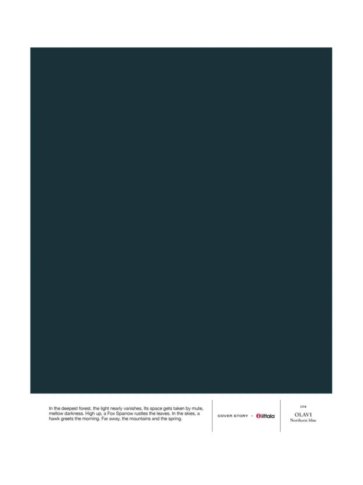 i04 OLAVI on klassisen tummanpuhuva petrooliin vivahtava tumma sininen. Sisätilojen pinnoilla tumma sininen on hyvin luonnonläheinen ja rauhoittava väri. i04 OLAVI – Northern blue antaa seinille ja katolle pehmeästi valoa heijastavan mattapinnan. Sävy on osa Cover Story x Iittala -tilavärikokoelmaa. A4-kokoinen tarrataustainen värimalli on maalattu aidolla täyshimmeällä Cover Story -maalilla, joten voit olla varma, että sävy on sama kuin varsinaisessa maalissa. Mallitarran voi liimata helposti suoraan maalattavalle pinnalle ja katsoa, miltä sävy näyttää erilaisissa valaistuksissa – valon laatu ja määrä vaikuttavat merkittävästi siihen, miten havaitsemme värin.