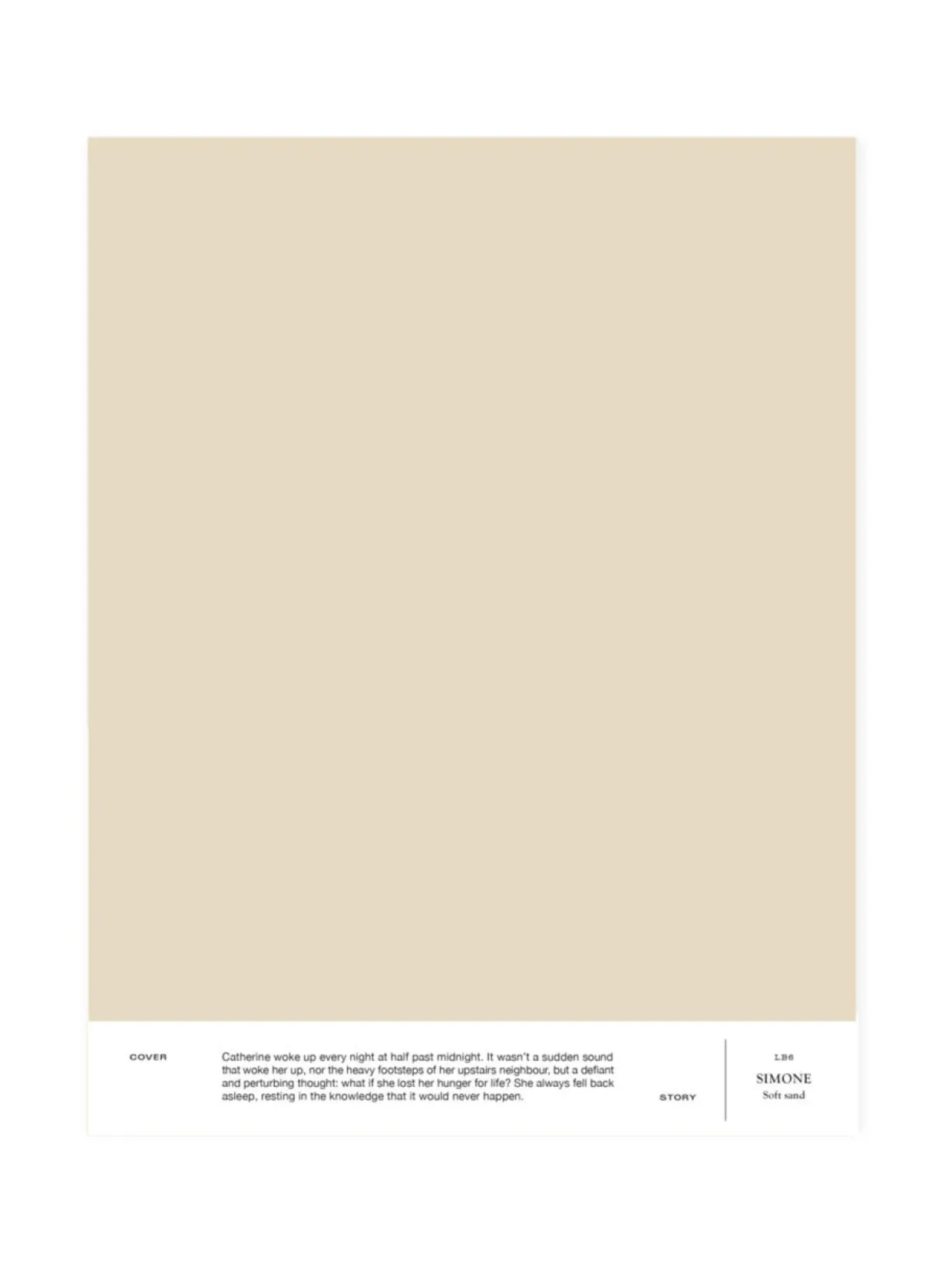 LB6 SIMONE on hiekkainen beige, joka murtaa kauniisti kirkkaita värejä tai toimii osana pehmeän vaaleaa tunnelmaa. A4-kokoinen ja tarrataustainen värimalli on maalattu aidolla täyshimmeällä Cover Story -maalilla, joten voit olla varma, että sävy on sama kuin varsinaisessa maalissa. Mallitarran voi liimata helposti suoraan maalattavalle pinnalle ja katsoa, miltä sävy näyttää erilaisissa valaistuksissa, sillä valon laatu ja määrä vaikuttavat merkittävästi siihen, miten havaitsemme värin.