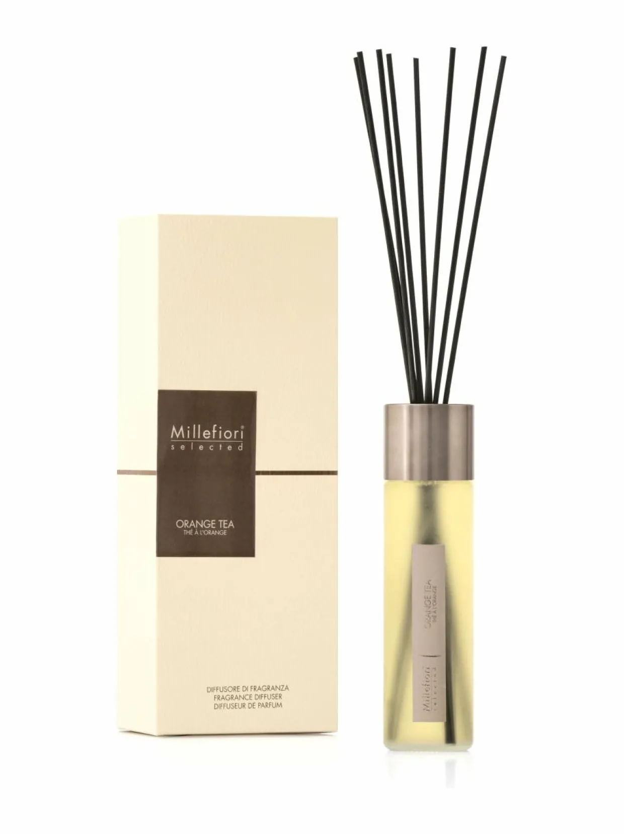 Selected on Millefiorin trendikäs tuoksusarja, jonka avulla voit ilmentää persoonallisuuttasi yllättävien huonetuoksujen kautta. Kapea maitolasinen pullo on myös tyylikäs sisustuselementti. Orange Tea -tuoksu yhdistää teenlehtien tuoksun kukkaiseen sydäntuoksuun, joka kehittyy lämpimään vetiver-ruohon juurituoksuun.