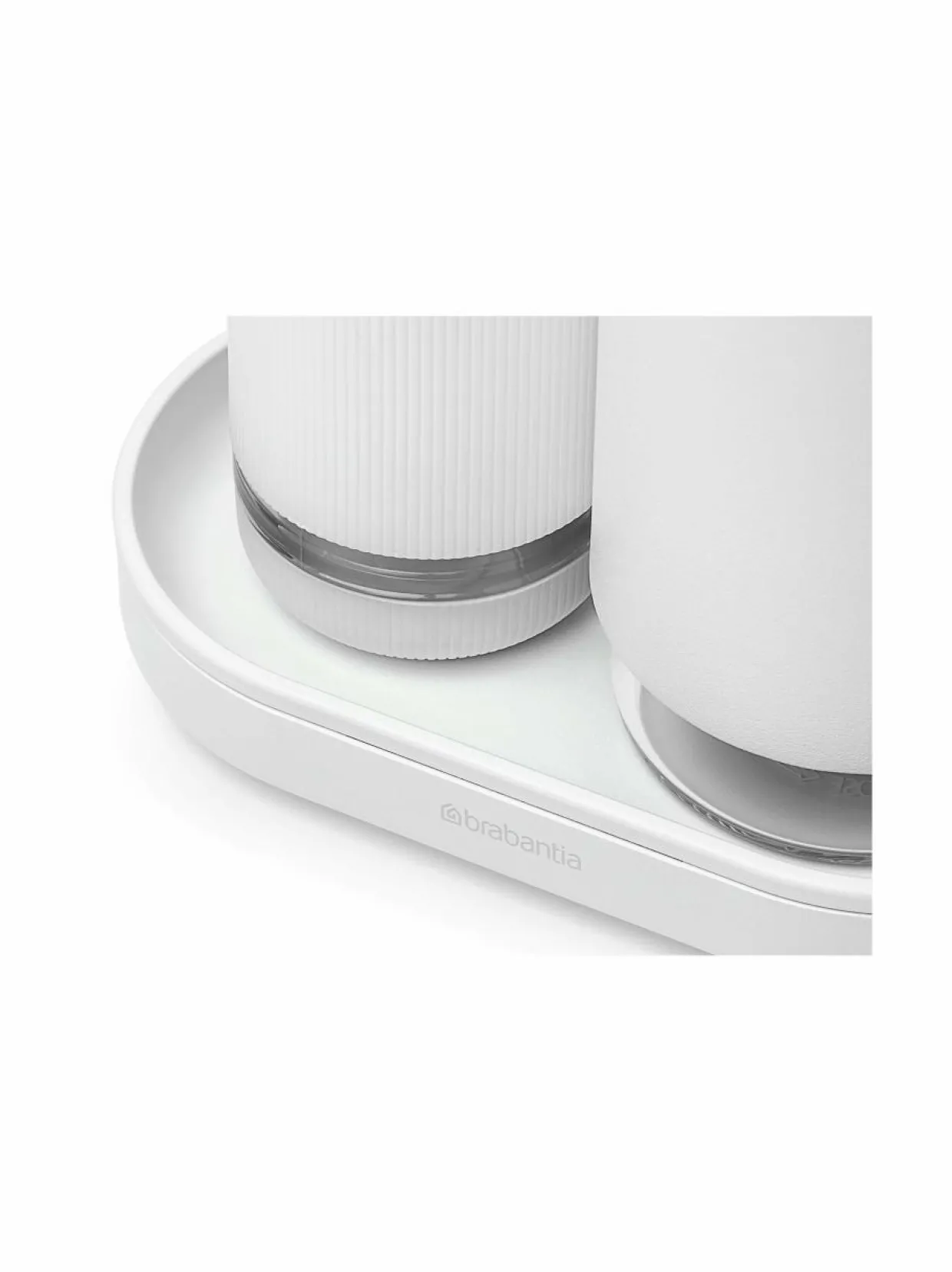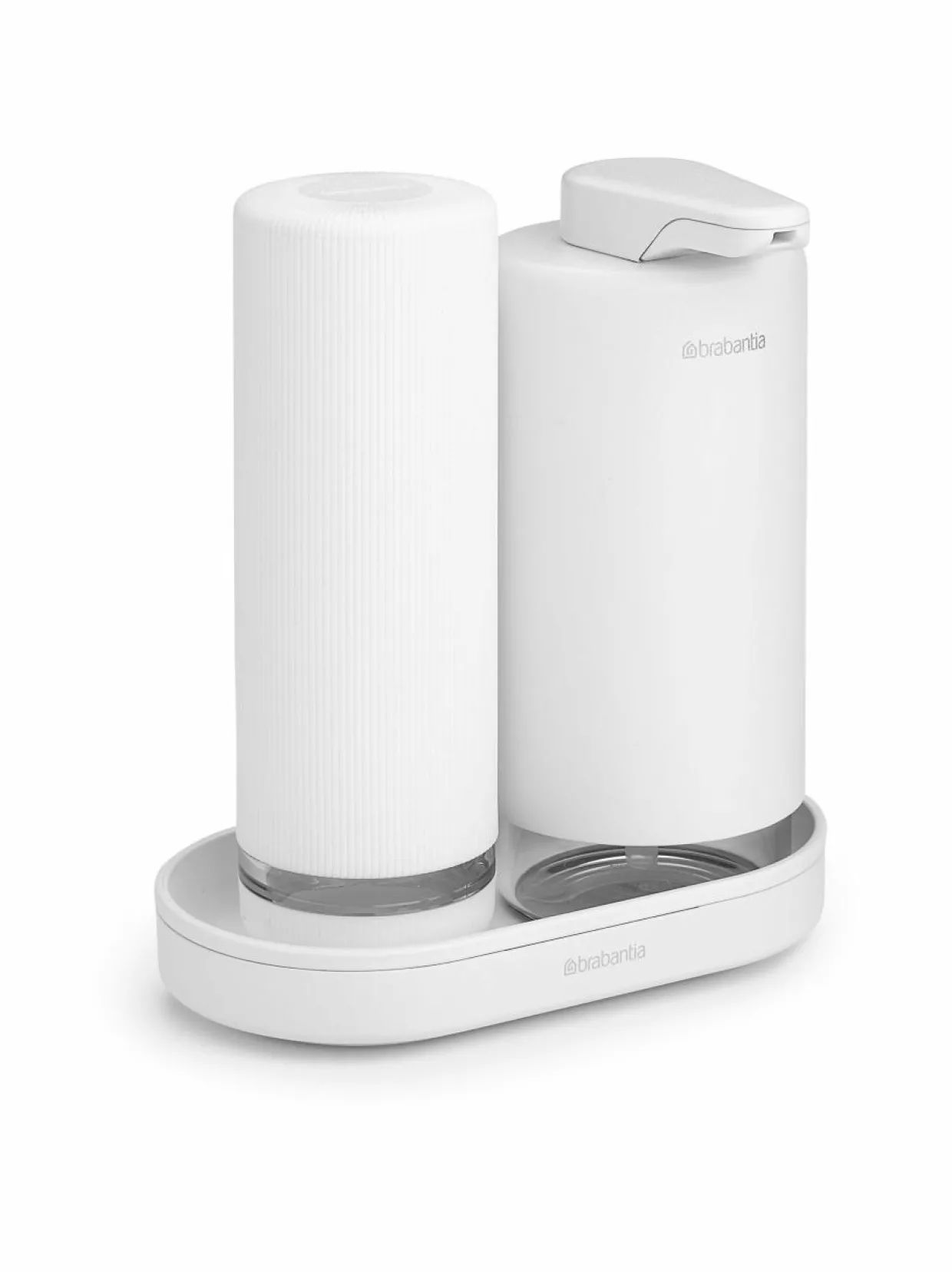 Brabantia SinkStyle -settiin kuuluu kaksi saippua-annostelijaa sekä alusta. Molempien annostelijoiden vetoisuus on 200 ml. Esteettisellä raitatekstuurilla viimeistelty saippuapuristin on ihanteellinen tiskiaineelle (pullo toimii puristamalla). Klassisempi saippuapumppu sopii hyvin käsisaippualle tai käsivoiteelle.