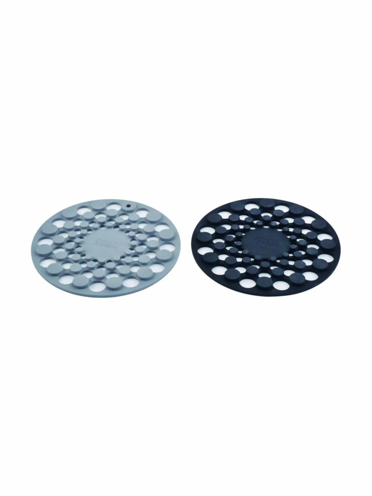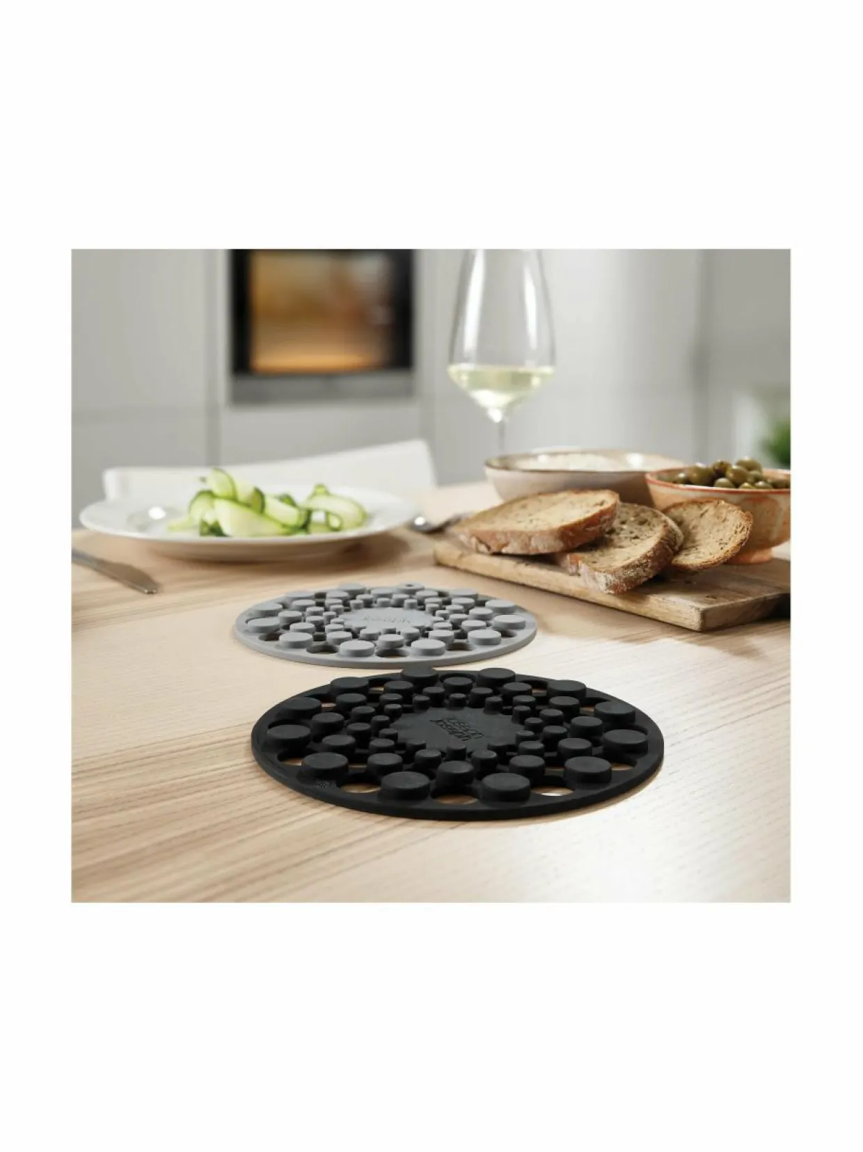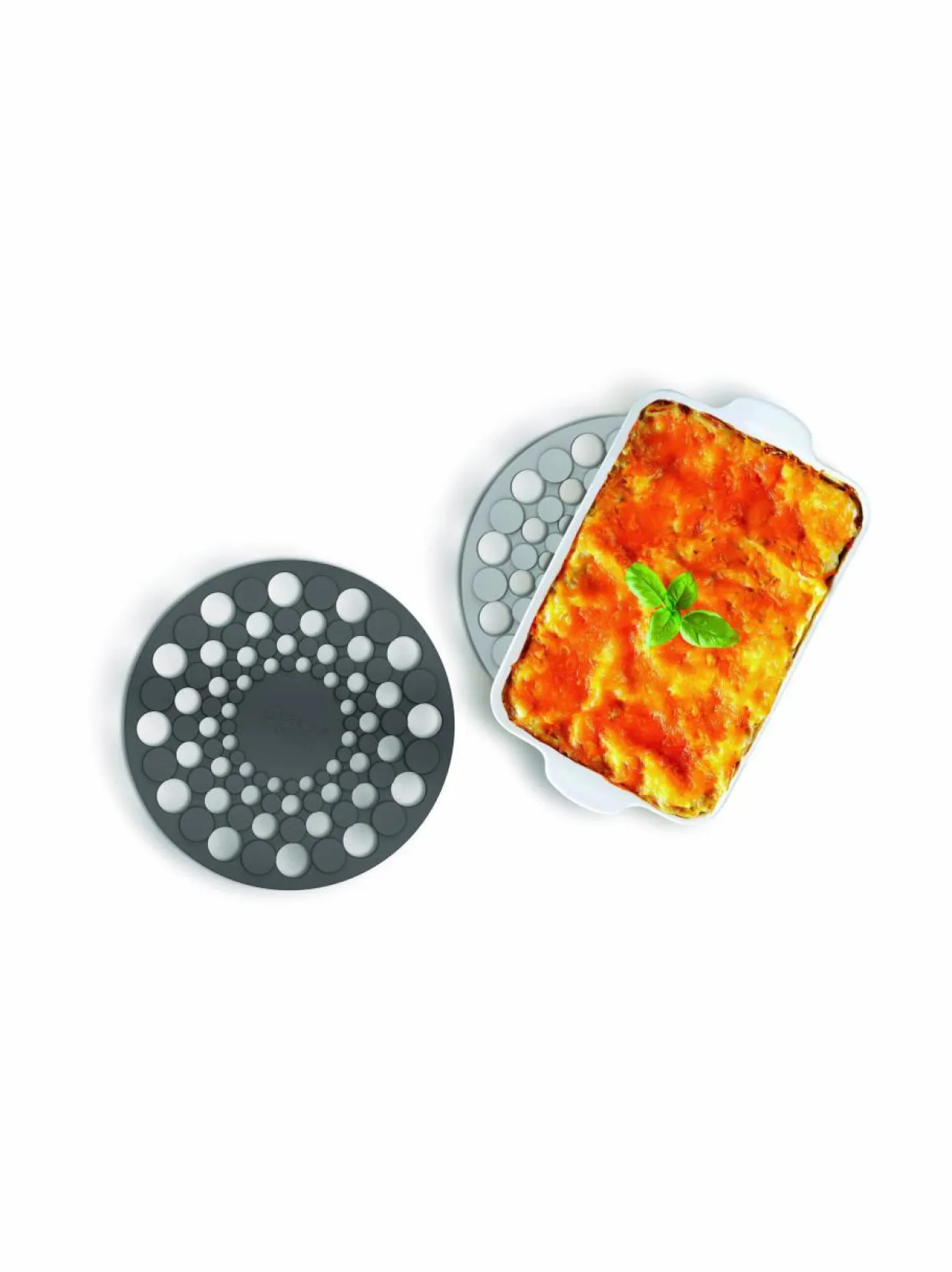 Joseph Joseph Spot-On -settiin sisältyy kaksi pyöreää pannunalusta. Irrota ne toisistaan ja aseta pisteet ylöspäin. Materiaali on kuumankestävää silikoniseosta. Astianpesukoneen kestävä.