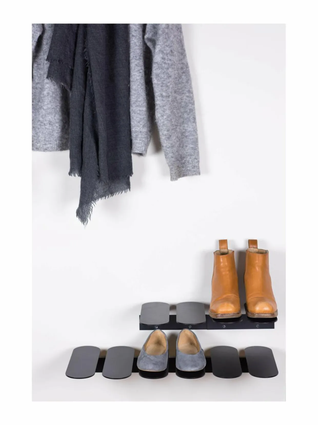 Step S -kenkätelineeseen saa tyylikkäästi esille kaikenlaiset kengät. Gustav Rosénin suunnittelemassa telineessä on kaksi soikeaa ja hieman viistoa metallilevyä, joiden päällä kengät ovat siististi ja näyttävästi esillä. Useammalla hyllyllä rakennat vaikuttavan kokonaisuuden. Mitat ovat 9 x 20 x 29 cm.