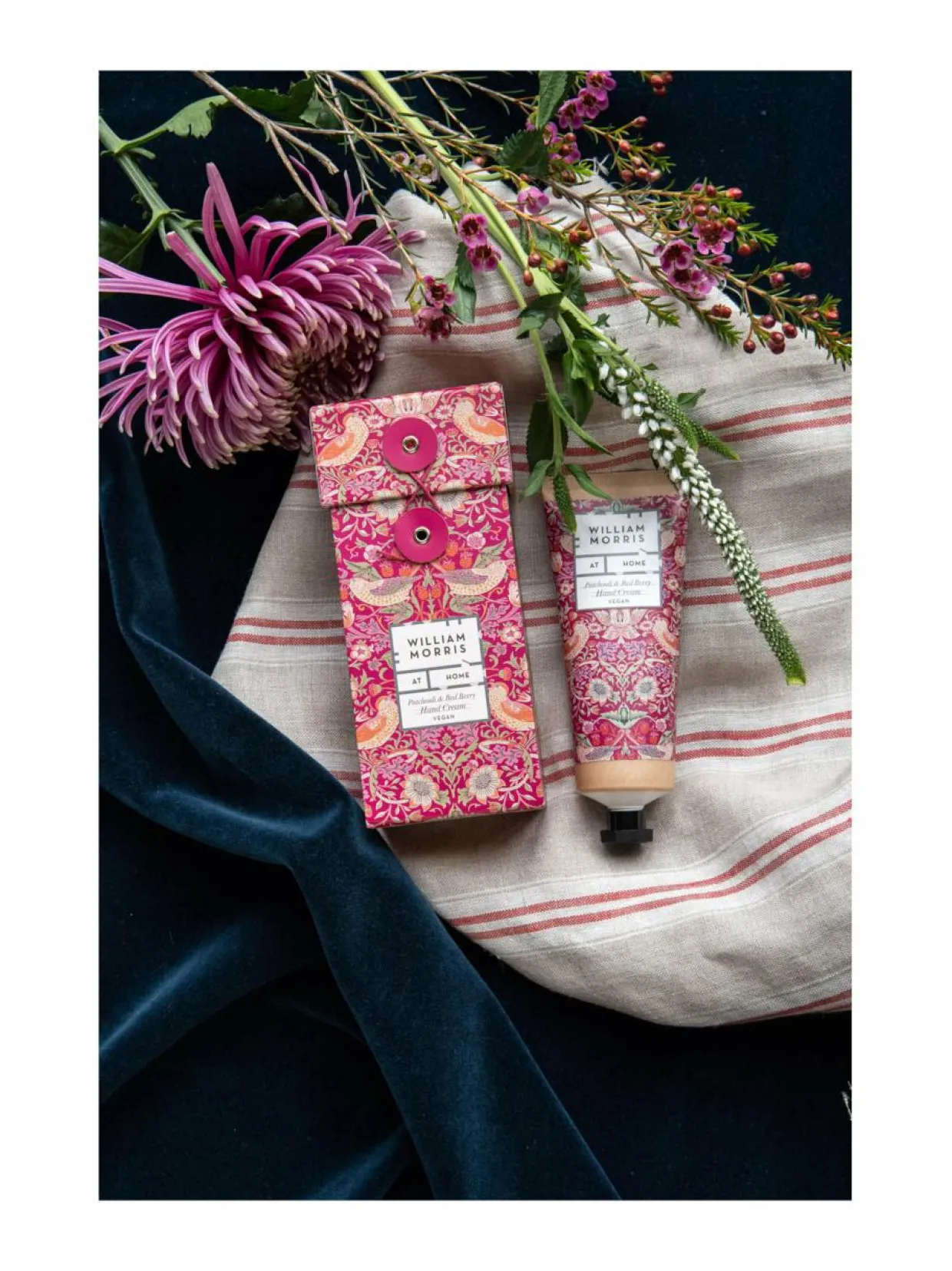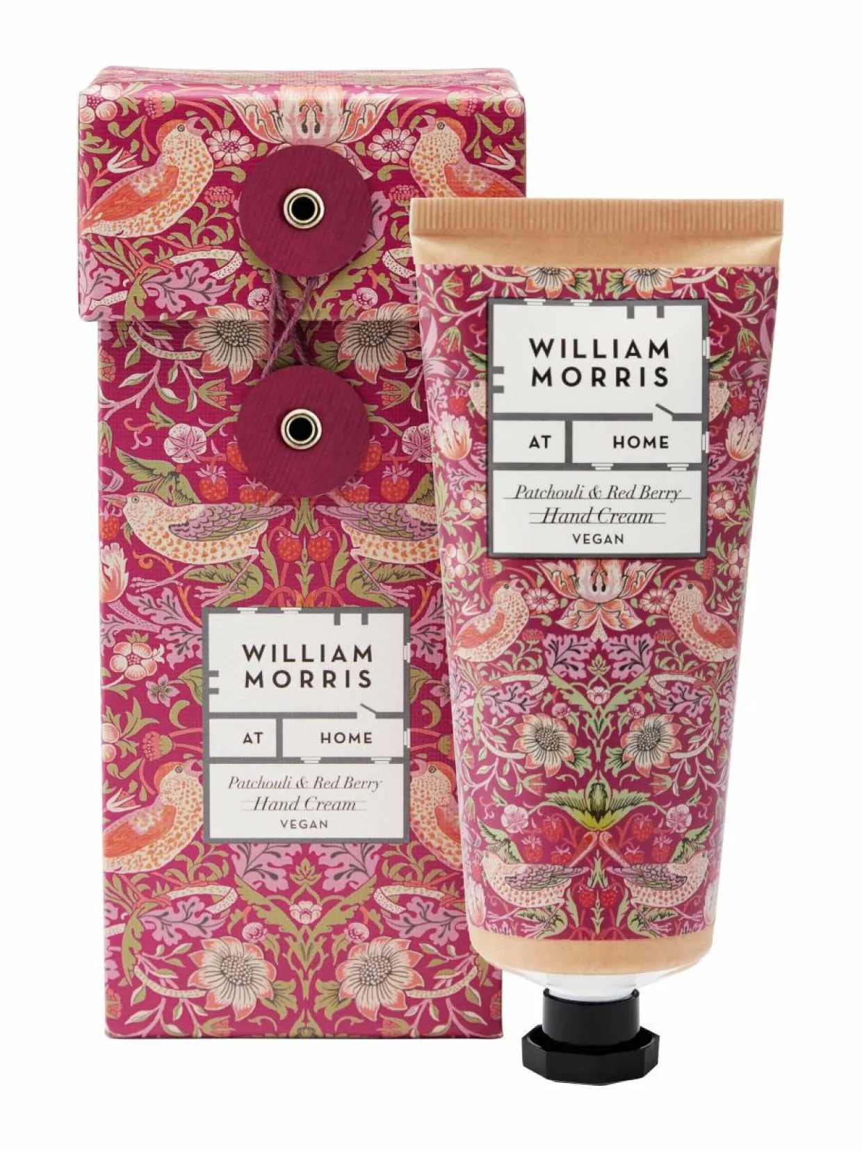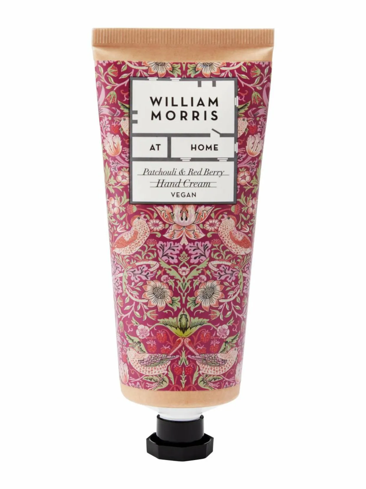William Morris At Home Strawberry Thief -käsivoide 100 ml on runsas voide patsulin ja punaisten marjojen tuoksulla.