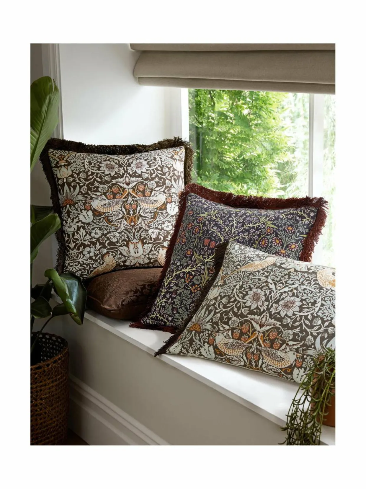 William Morris At Home Strawberry Thief -sisustustyyny on neliönmuotoinen tyyny hapsureunoilla. Tyynyä koristava printti on saanut inspiraationsa rastaista, jotka olivat hiipineet William Morrisin mansikkaverkkojen alle hänen puutarhassaan Kelmscott Manorissa Oxfordshiressa. Printti on suunniteltu vuonna 1883.