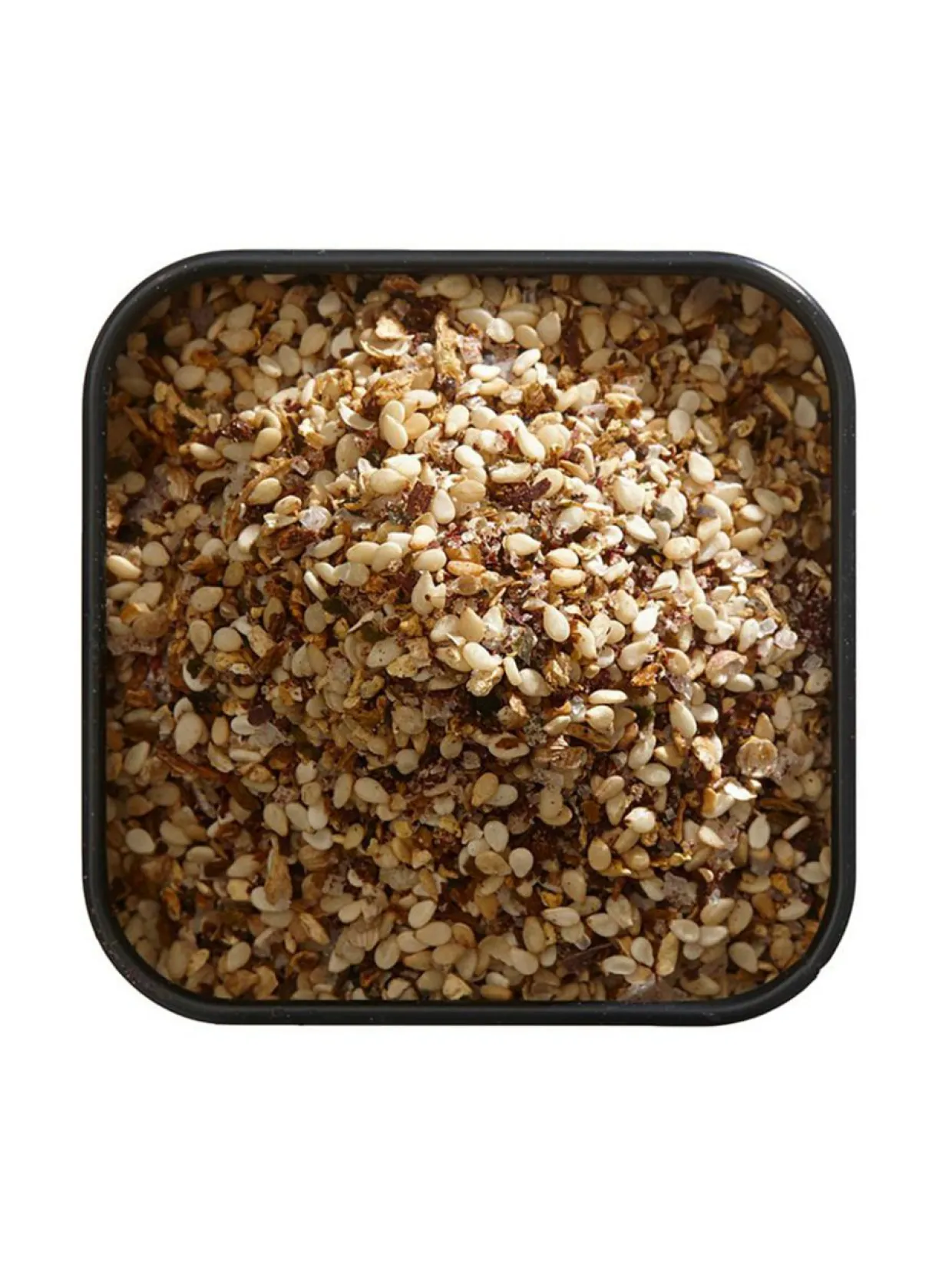 Ainesosat: Paahdettu valkoinen seesami, herkkutatti, suolahiutaleet, sokeri, sumakki, korianteri, wakame-merilevä, mustapippuri. Ingredienser: Rostad vit sesam, sötpotatis, saltflingor, socker, sumak, koriander, wakame-tång, svartpeppar.
