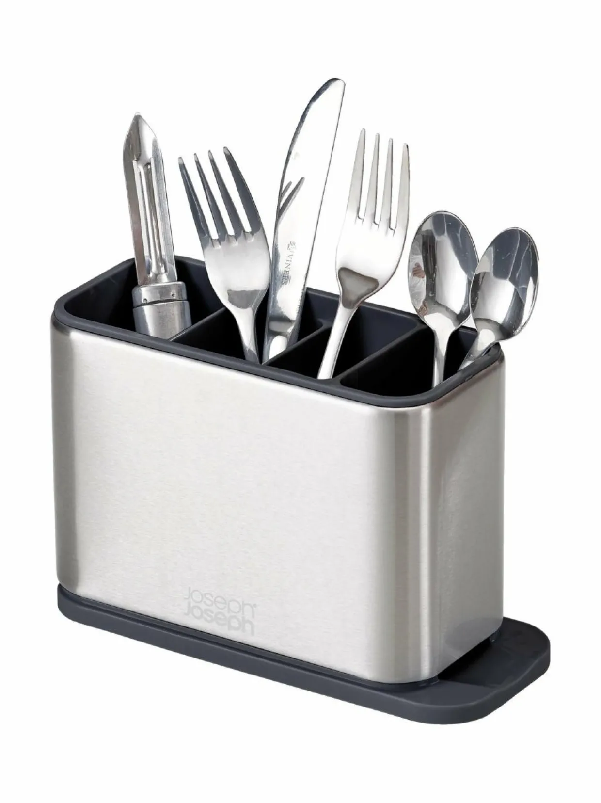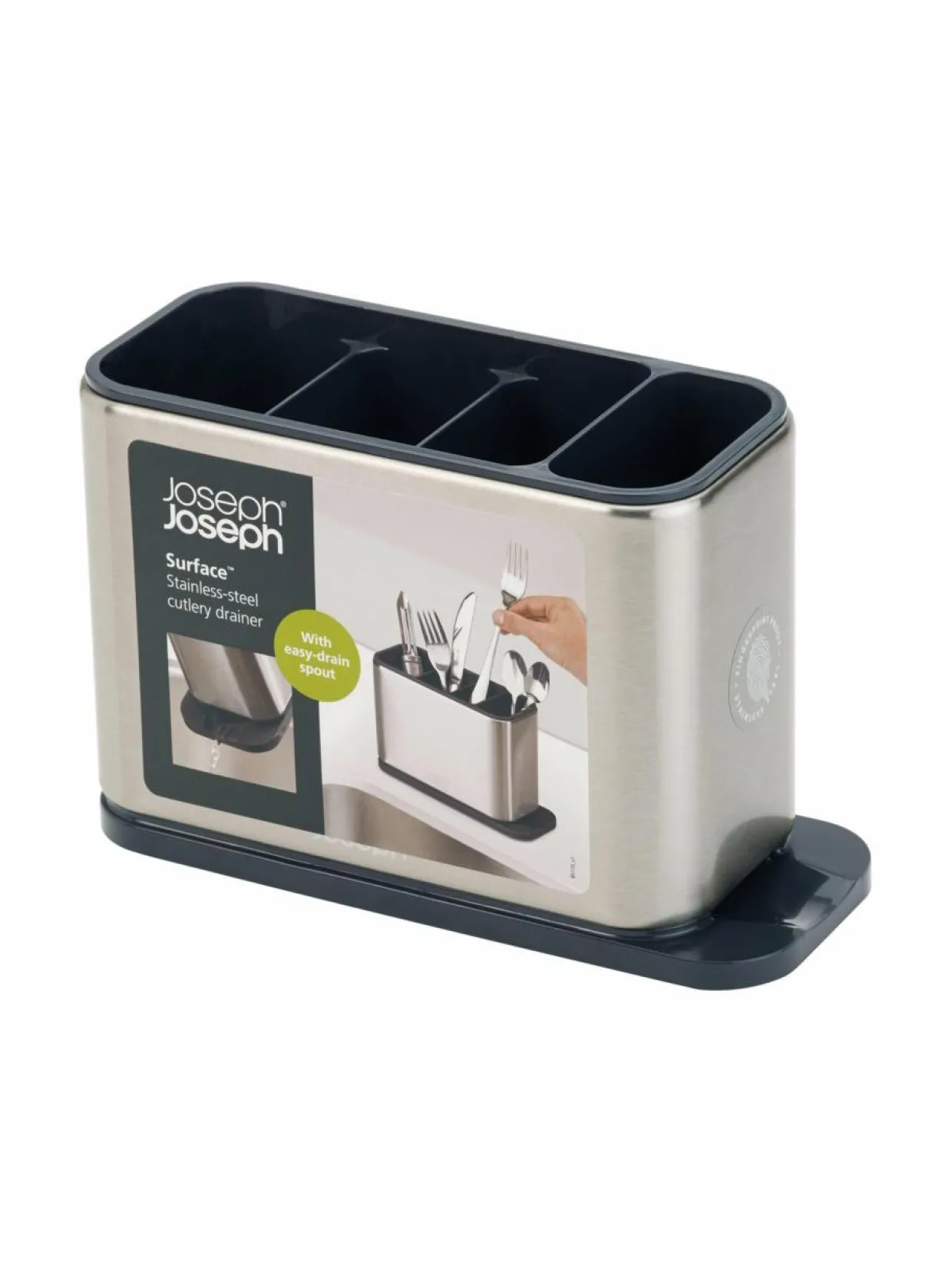 Joseph Josephin Surface-aterintelineessä on neljä lokeroa, joihin haarukat, veitset, lusikat ja muut keittiövälineet on helppo lajitella pesun jälkeen. Yksi lokeroista on hieman matalampi, joten myös kahvilusikat pysyvät helposti saatavilla. Telineen pohjalle kertynyt vesi on helppo valuttaa pois päädyn aukosta vain pienellä kallistusliikkeellä.