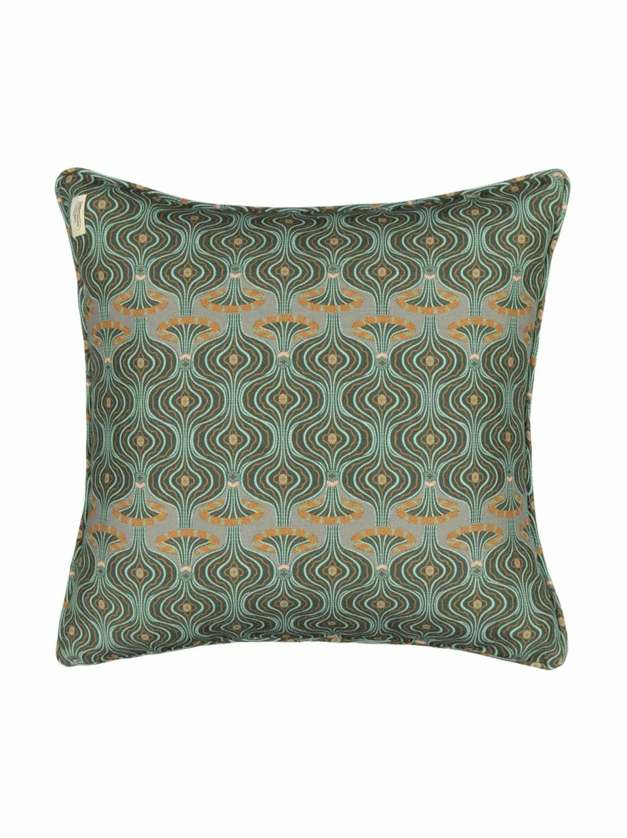 Silkille sekä pellavalle painettu tyynynpäällinen. Silkkistä etupuolta koristaa Tigerwoods-printti ja pellavaista taustaa sekä terettä geometrinen kuviointi. Tyynynpäällisessä on piilovetoketju.