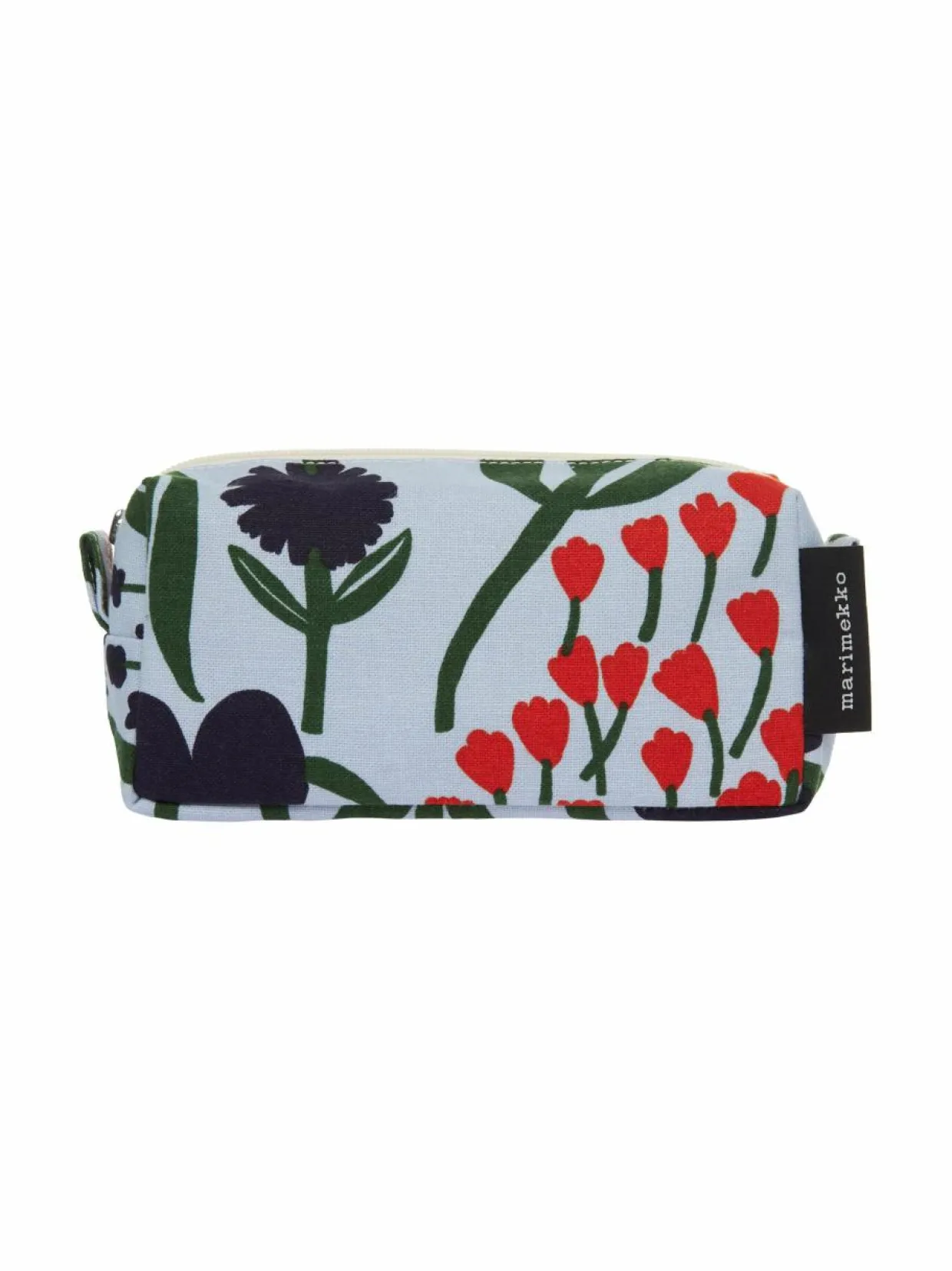 Marimekon Tiise Palsta -kosmetiikkalaukkua koristaa kukkakuvio rohkealla väriyhdistelmällä. Suunnittelija Lotta Maija on ammentanut inspiraatiota Palstan energiseen kuvioon kesämökin kukkapenkkien kasveista.