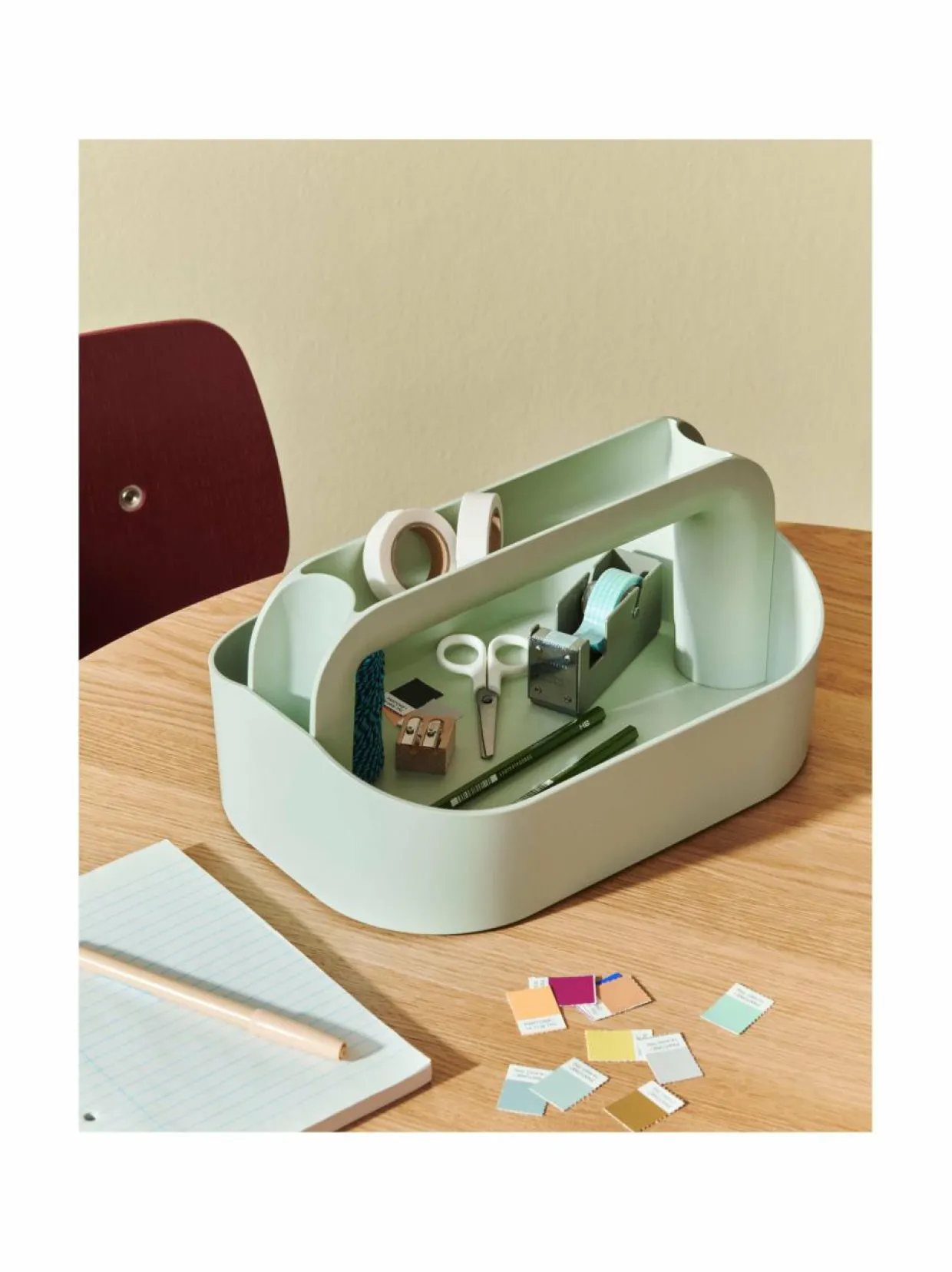 Hayn Tool Box -säilytyskori uudistettuna versiona on saatavilla eri väreissä. Kahvallinen kori on helposti puhdistettava ja monipuolinen tavaroiden järjestelemiseen esim. työpöydällä tai hyllyllä. Myös kahvan päälle ja sivuihin voi asettaa pientavaroita.