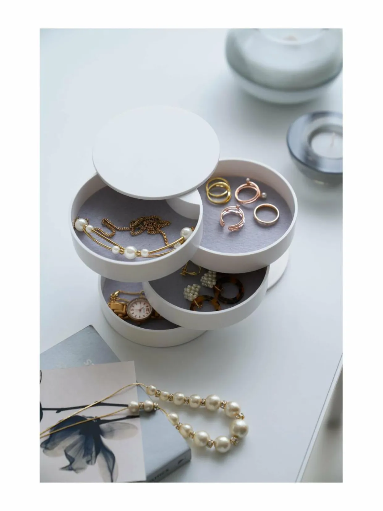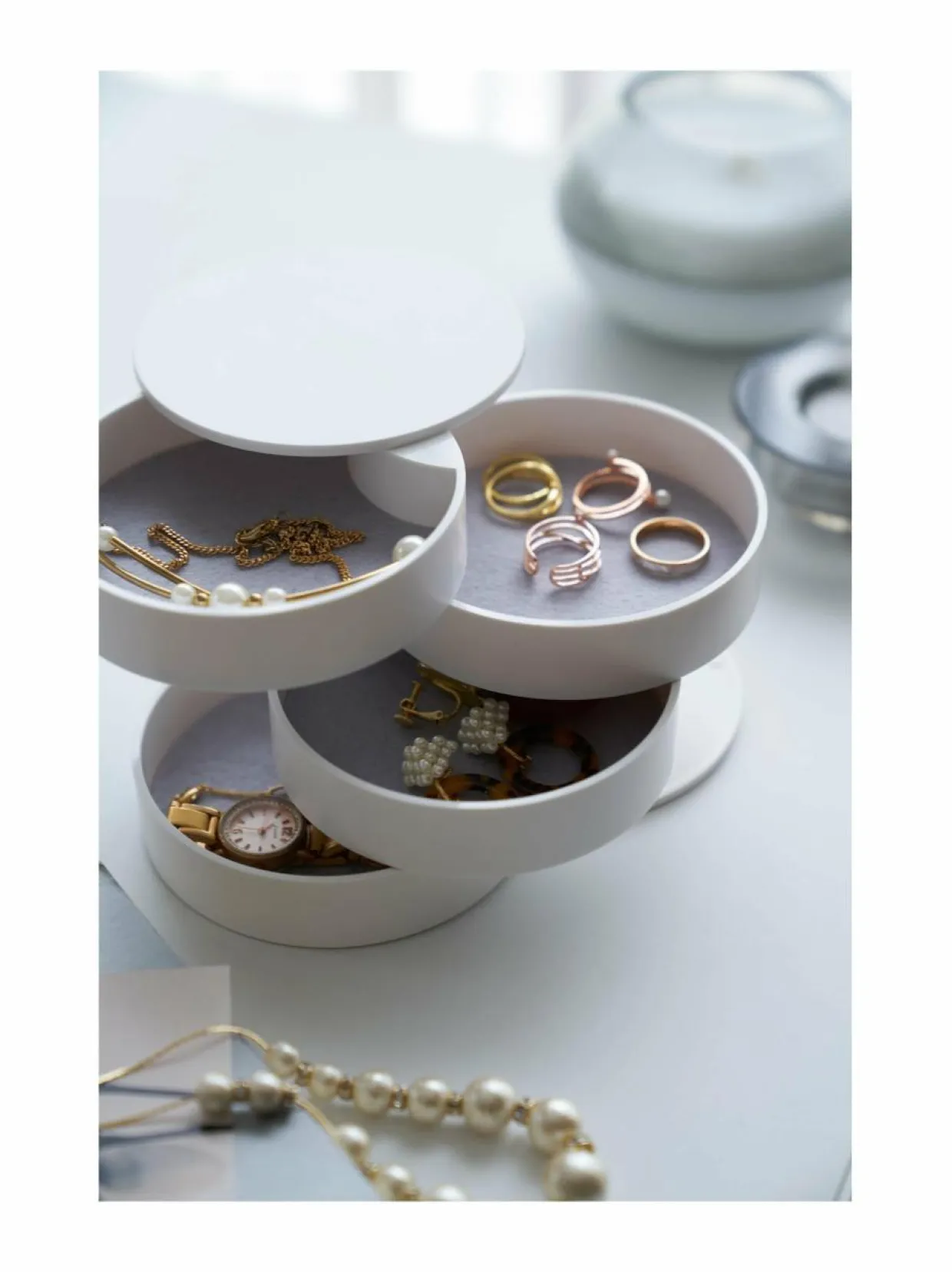 Yamazakin Accessory Tray -korulipas on minimalistisen tyylikäs ja tilava. Lippaassa on neljä kerrosta, joissa korut ja muut pikkutavarat pysyvät siistissä järjestyksessä. Kerroksia kääntämällä saat kaikki korut kerralla näyttävästi esille.