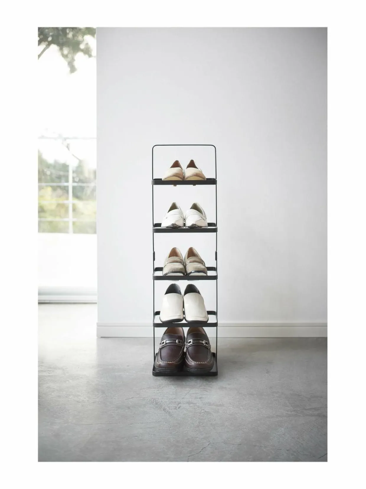 Kooltaan kompakti Yamazaki Tower Shoe Rack -kenkähylly sopii vaivatta kapeaankin eteiseen, vaatehuoneeseen tai kaappiin. Kevyt, teräsrunkoinen teline on helppo nostaa ja siirtää paikasta toiseen. Hyllyyn mahtuu viisi paria kenkiä. Tuote on koottava. Suunniteltu Japanissa.