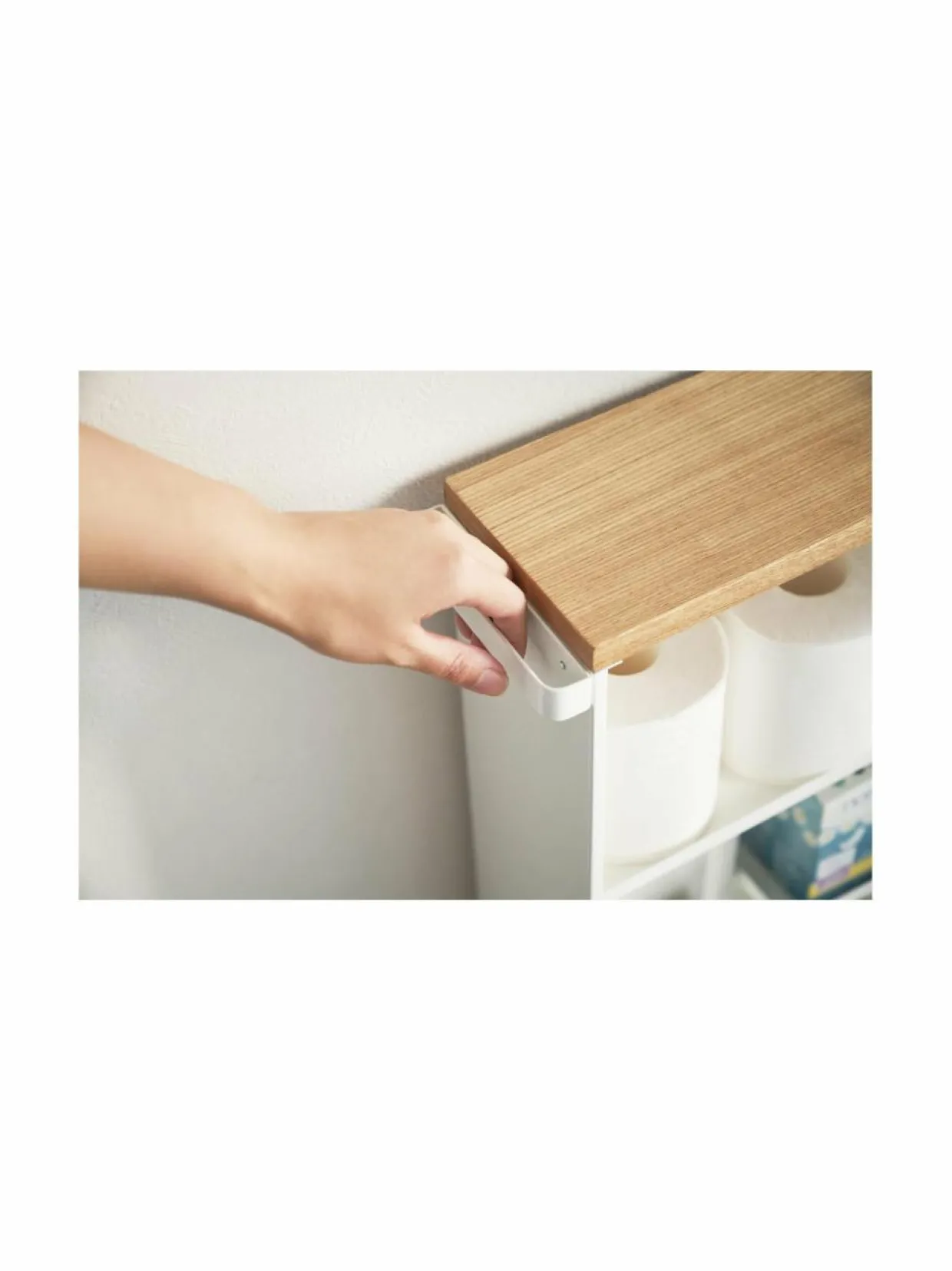 Yamazaki Tower Slim -kärryssä voi näppärästi säilyttää erilaisia kylpyhuoneen tarvikkeita kuten vessapapereita ja siivousaineita. Puisen kannen päälle voi asetella pieniä koriste-esineitä tai kauniita koruja. Modernin ja kapean designin ansiosta kärry mahtuu jopa pienempiinkin kylpyhuoneisiin.
