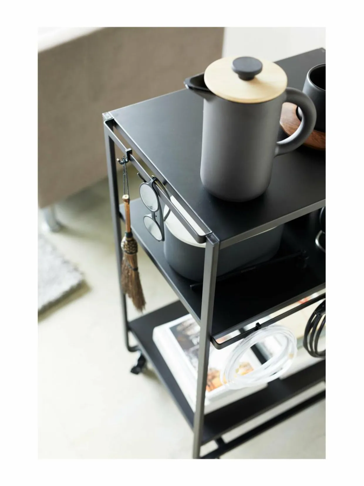 Yamazakin monikäyttöisen Tower-tarjoiluvaunun kolme hyllyä ja näppärät koukut tuovat lisää lasku- ja säilytystilaa esimerkiksi keittiöön, oleskelutiloihin tai työhuoneeseen. Jauhemaalatusta teräksestä valmistetussa vaunussa on pyörät, joiden ansiosta vaunua on helppo siirtää tilasta toiseen.