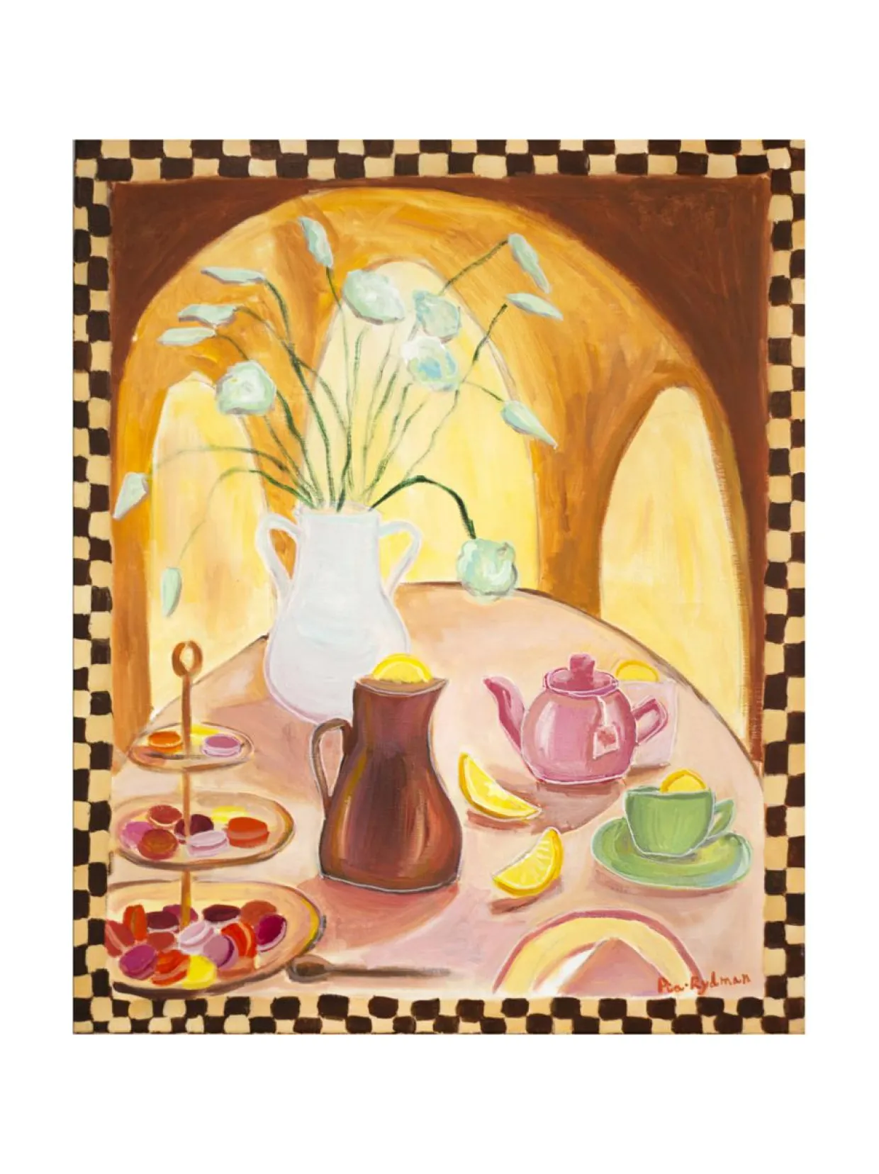 Vaaleanpunainen teehetki on taiteilija Pia Rydmanin alkuperäinen akryylimaalaus. Se on maalattu pellavakankaalle, koko 73×60 cm, ripustusvalmis.