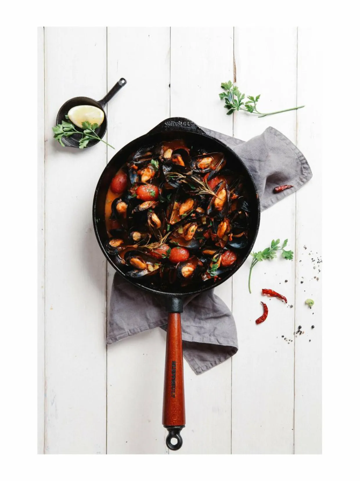 Korkealaatuinen valurautainen paistinpannu pyökkikahvalla.