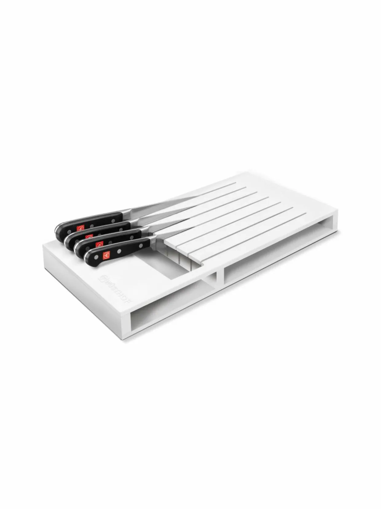 Wüsthof-veitsiteline säilyttää veitset terävinä ja järjestyksessä siististi vetolaatikossa. Telineestä veitsen kahvaan on helppo tarttua ja terät ovat samalla suojattuina. Muovisen telineen voi pestä tiskikoneessa. Telineeseen menee seitsemän veistä, joiden terän pituus on enintään 23 cm. Mitat L 22 x K 4 x S 43 cm.