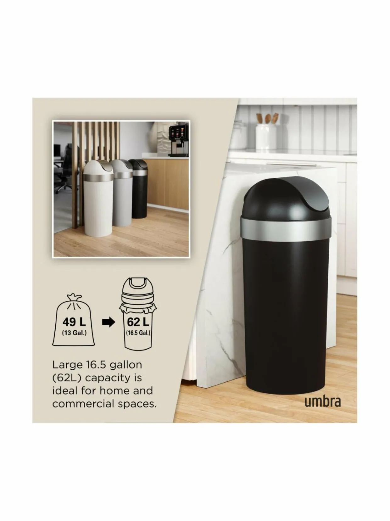 Umbran Venti-jäteastia on moderni ja käytännöllinen ratkaisu kodin roskien keräämiseen. Se on valmistettu kestävästä materiaalista. Roskakorin swing-kansi on erittäin helppokäyttöinen. Jäteastia on myös helposti puhdistettava ja tyhjennettävä. Vetoisuus 62 litraa.