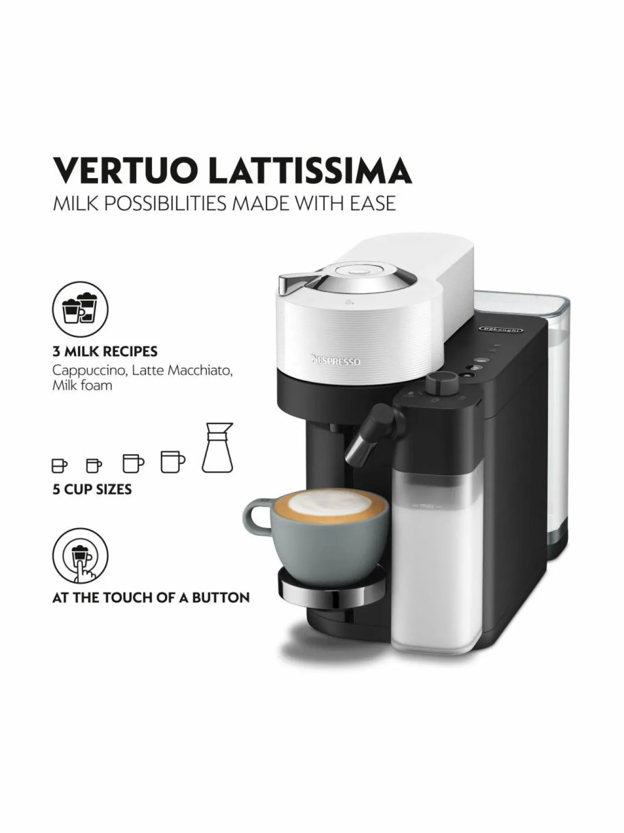Mitä ikinä mielesi tekeekin – isoa kuppia kahvia tai pientä – Espressoa – Vertuo Lattissima täyttää odotuksesi. Integroidun maitokannun ansiosta Vertuo Lattissima tarjoaa mustien kahvireseptien rinnalle myös Cappuccino, Latte Macchiato ja maitovaahtoreseptit.Seitsemästä kahvikoosta juuri omaan tilanteeseesi sopivin tai valmista ylellinen maitokahvi ja nauti laadukkaasta kahvihetkestä, vain napin painalluksella.