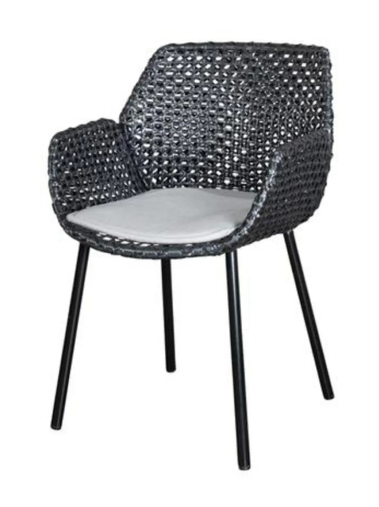 Kaunis Vibe-tuoli ulkokäyttöön. 59 lev, 56 syv, 83 kork, 46 cm istuinkork. Istuintyyny sisältyy hintaan, vaaleanharmaa Cane-Line Natté. Musta/antrasitti Cane-line Weave® -punosmateriaali, teräsrunko.