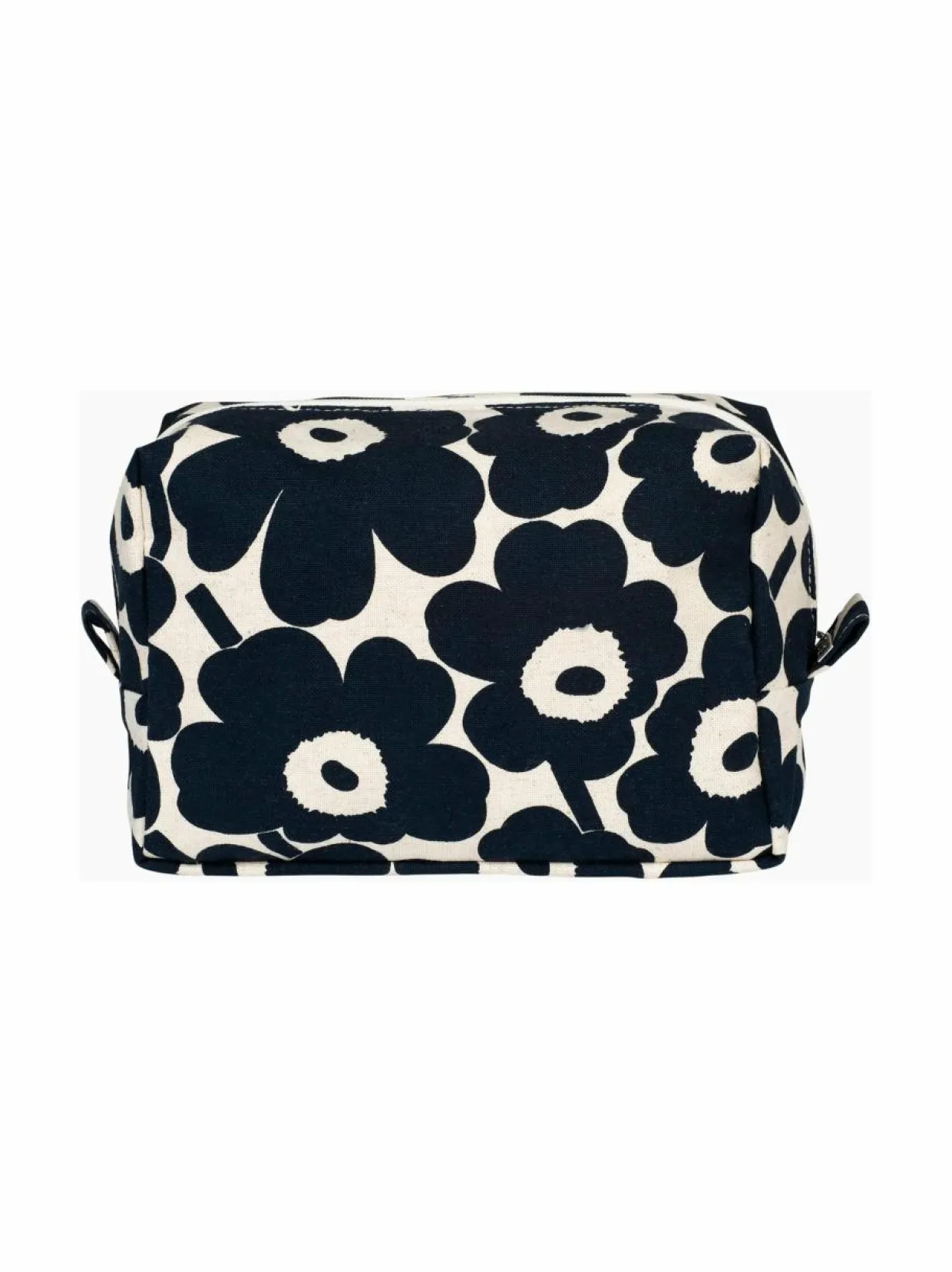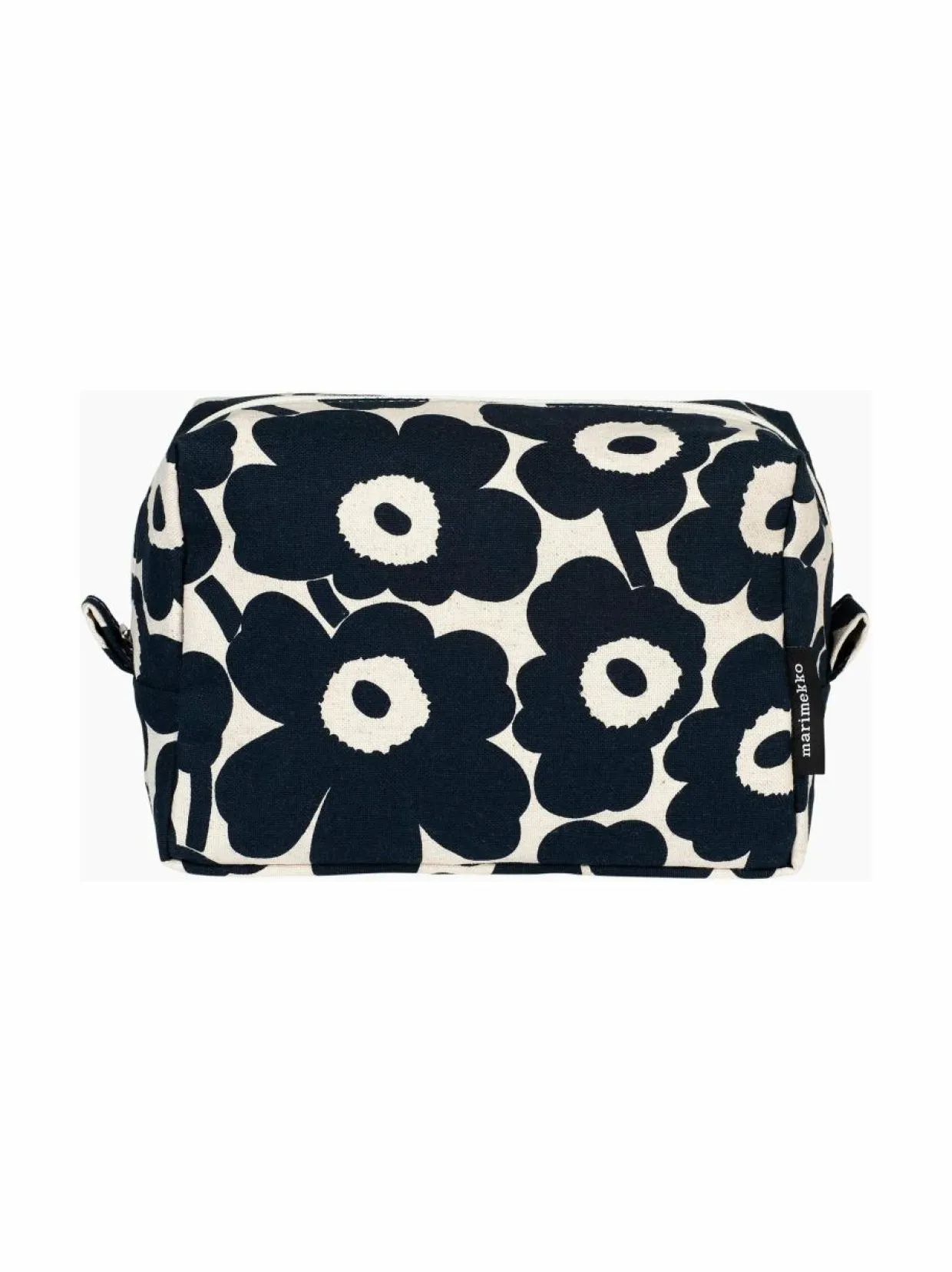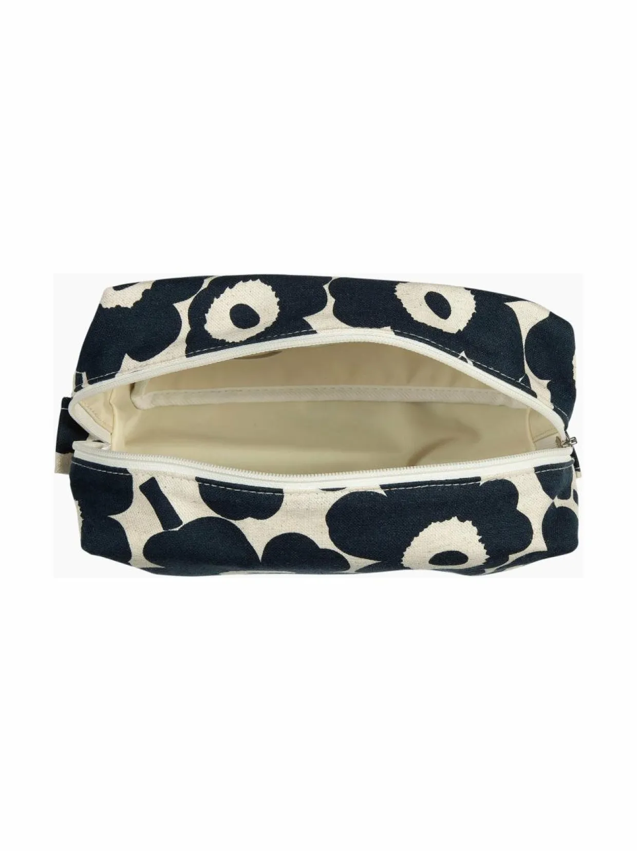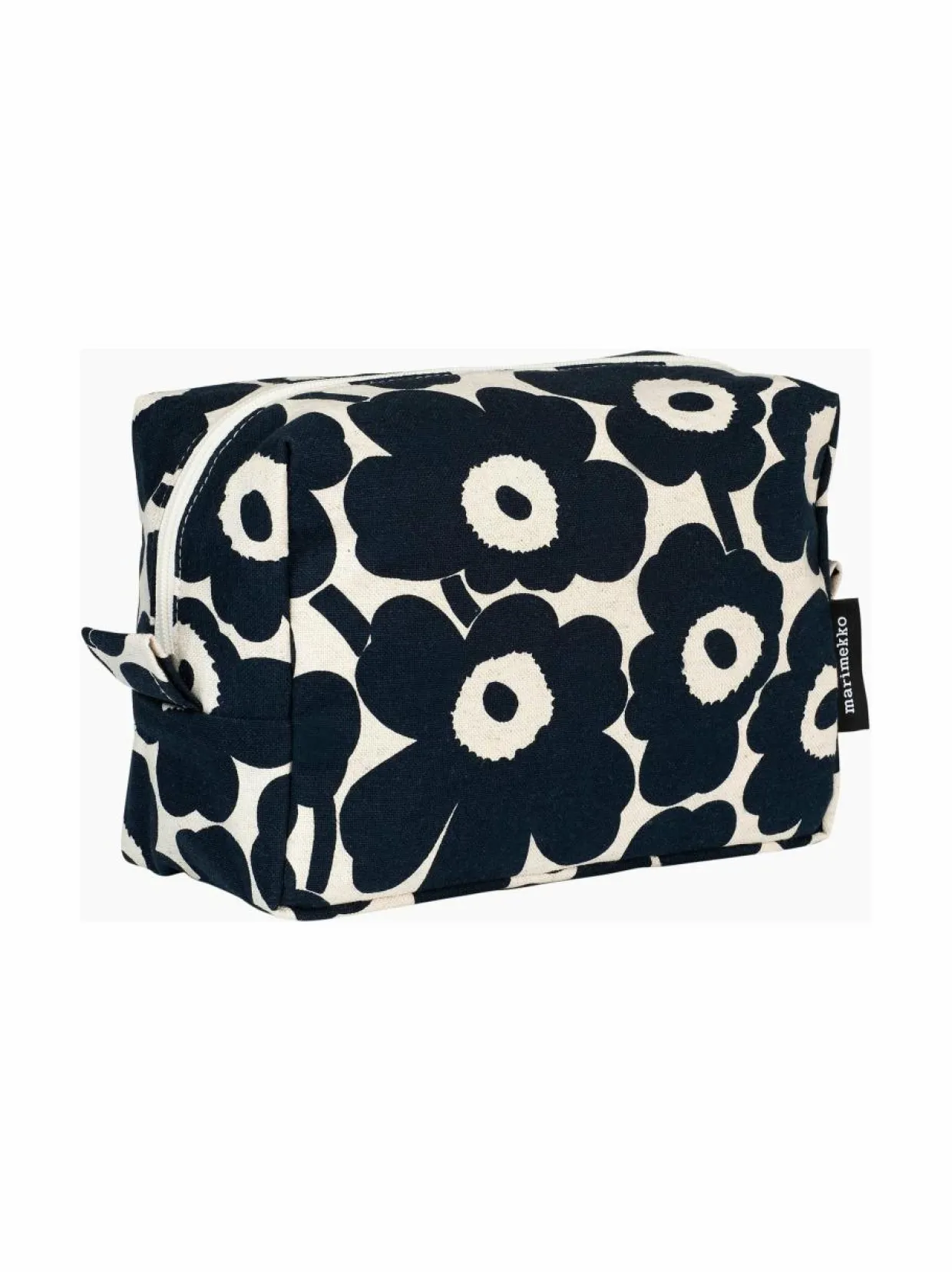Marimekon tilava Vilja-meikkilaukku on valmistettu valkaisemattomasta puuvillapellavasta, jossa on lianhylkivyyskäsittely ulkopuolella. Meikkilaukussa on vetoketjusuljenta ja sisäpuolella nailonvuori, kaksi isoa taskua sekä paikat meikkisiveltimille. Tummansininen Mini Unikko -kuosi on painettu Helsingissä.