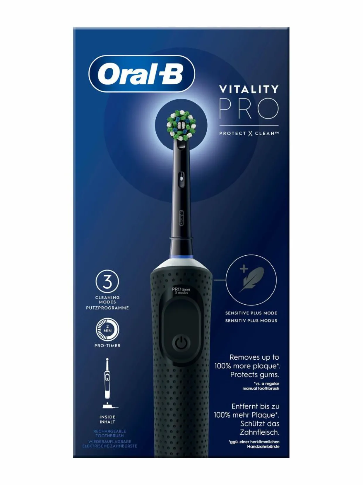 Ladattava Oral-B Vitality Pro -sähköhammasharja tarjoaa kliinisesti todistetun, ylivoimaisen puhdistuksen verrattuna tavalliseen käsikäyttöiseen hammasharjaan. Hammasharjassa on kolme harjaustilaa: päivittäinen puhdistus -, hellävarainen- ja erittäin hellävarainen tila uskomattoman hellävaraiseen harjaukseen. Varren ajastin auttaa harjaamaan hammaslääkärien suosittelemat kaksi minuuttia.