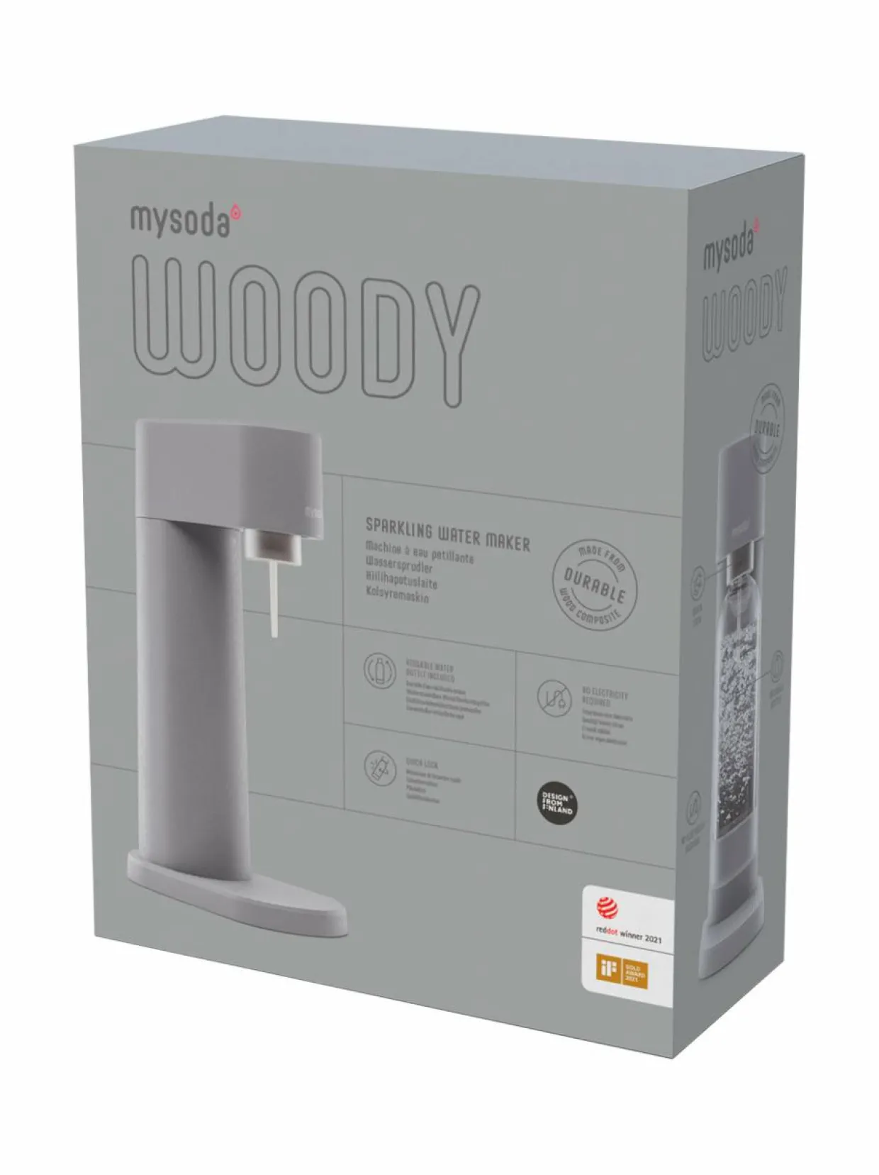 Mysoda Woody nostaa hiilihapotuslaitteiden ympäristöystävällisyyden uudelle tasolle. Laitteen pinnan puuhiput ja hienovarainen puun tuoksu tuovat palan metsää tyylikkäällä tavalla keittiöösi. Laitteen runko on valmistettu muovin sijaan puupohjaisesta biokomposiitista, jonka tuotanto perustuu lähes 100 % uusiutuviin raaka-aineisiin. Woody on suunniteltu helpottamaan arkeasi miellyttävällä tavalla.