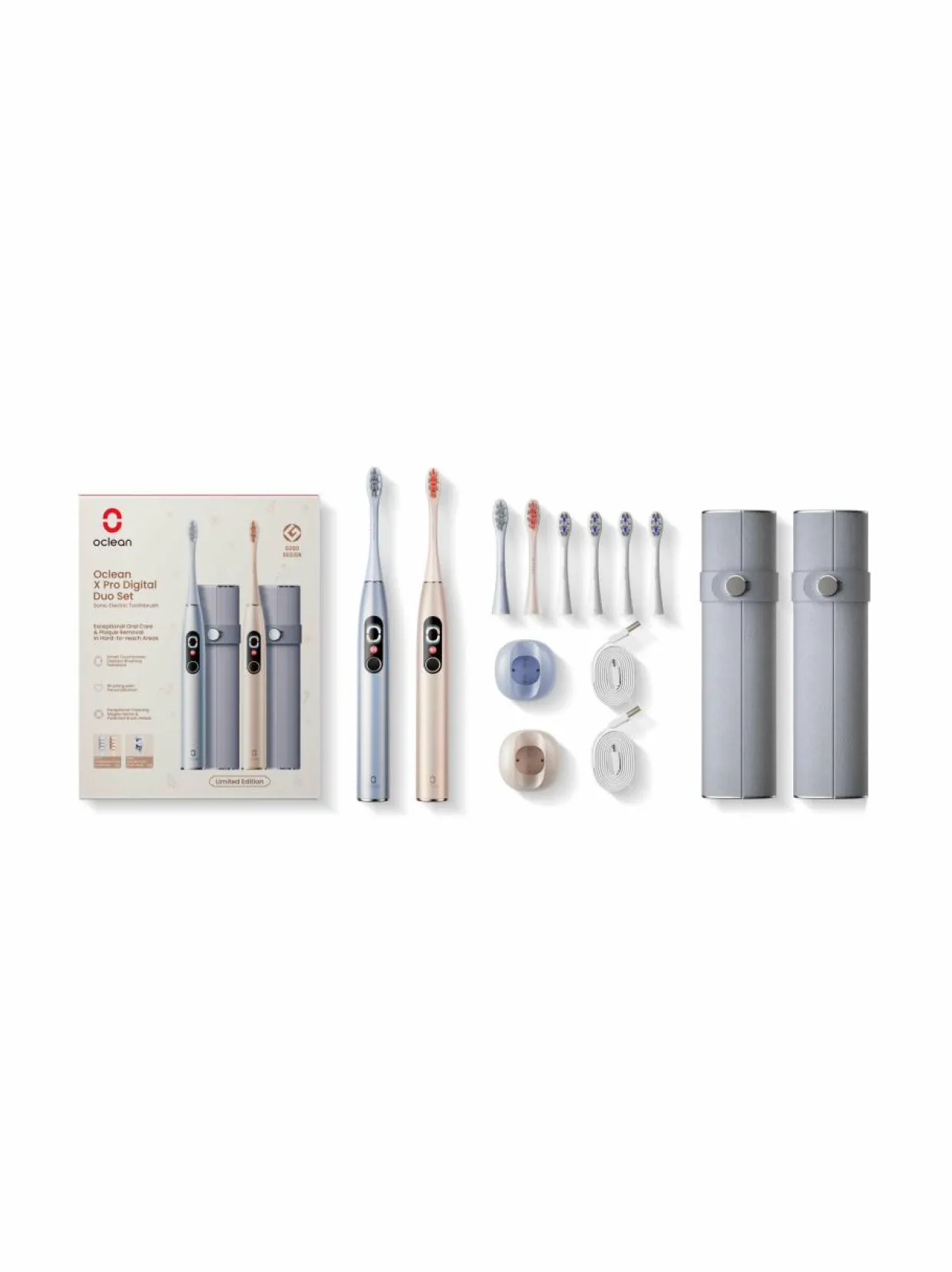 Ocleanin X Pro Digital Duo -sähköhammasharjapakkaus tarjoaa tehokkaan plakin poiston ja hampaiden puhdistuksen myös paikoissa, joihin on tavallisella hammasharjalla vaikea ulottua.