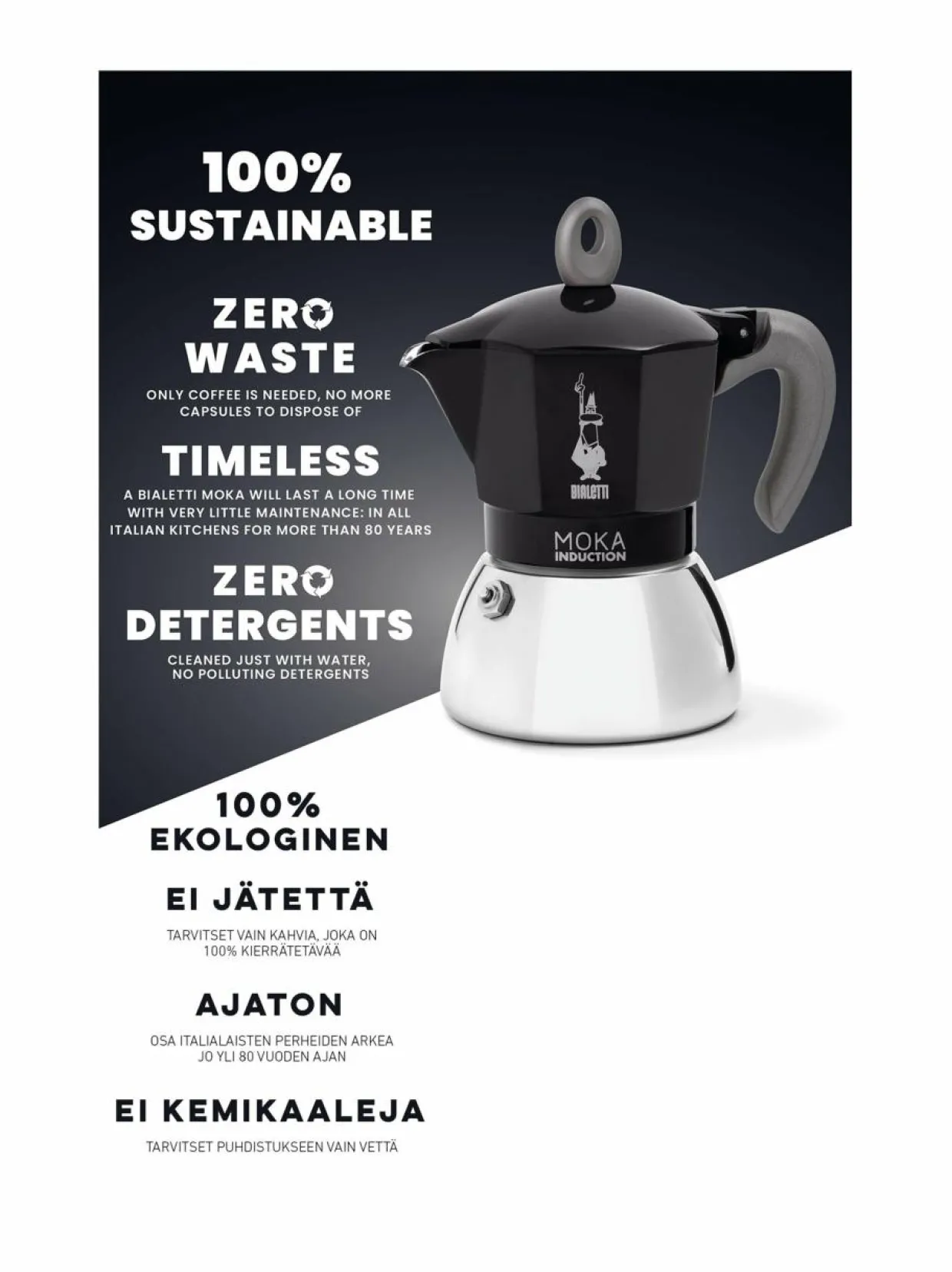 Aito ja alkuperäinen Bialetti Moka Express nyt myös induktiolle! Moka Induction keittimellä valmistat kerralla 4 kupillista täyteläistä espressoa.