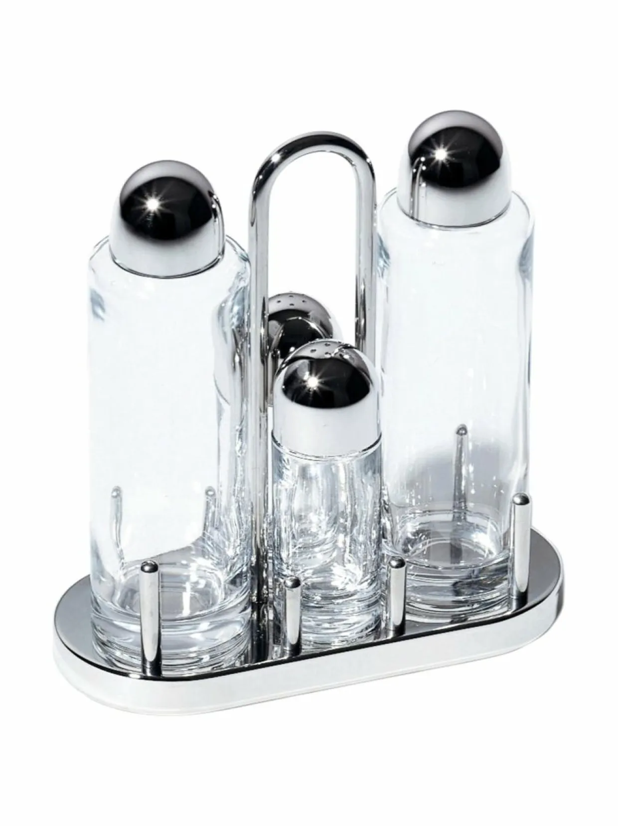 Ettore Sottsassin suunnittelema 5070-mausteteline on italialaisen muotoilun klassikko, joka on kuulunut Alessin valikoimaan jo vuosikymmenien ajan. Teräksisen alusta lisäksi telineeseen kuuluu öljy- ja etikkapullot sekä suola- ja pippurisirottimet.