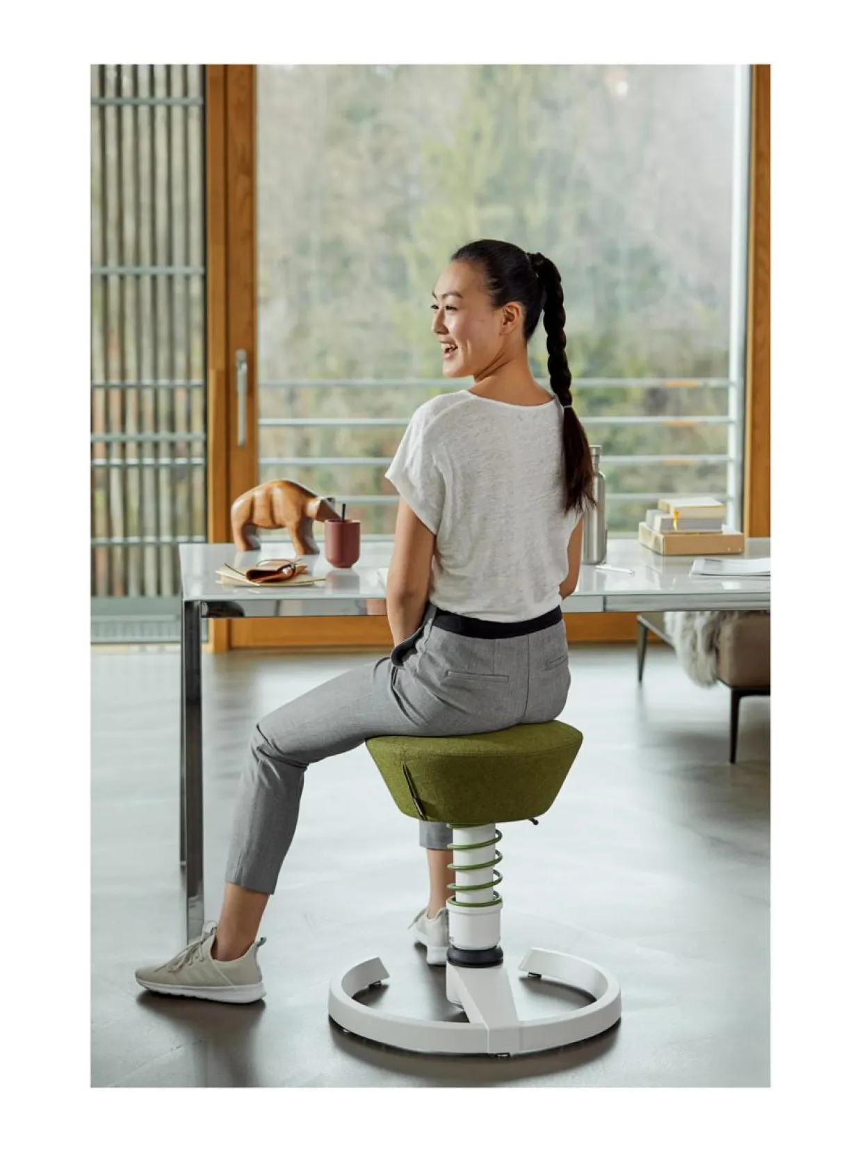 Tuolin kääntyvä nivel, joka on lähellä maata sekä jousi varmistavat, että jokaisella liikkeellä koko kehosi liikkuu. Vaikka nojaisit eteenpäin selkäsi pysyy suorana.