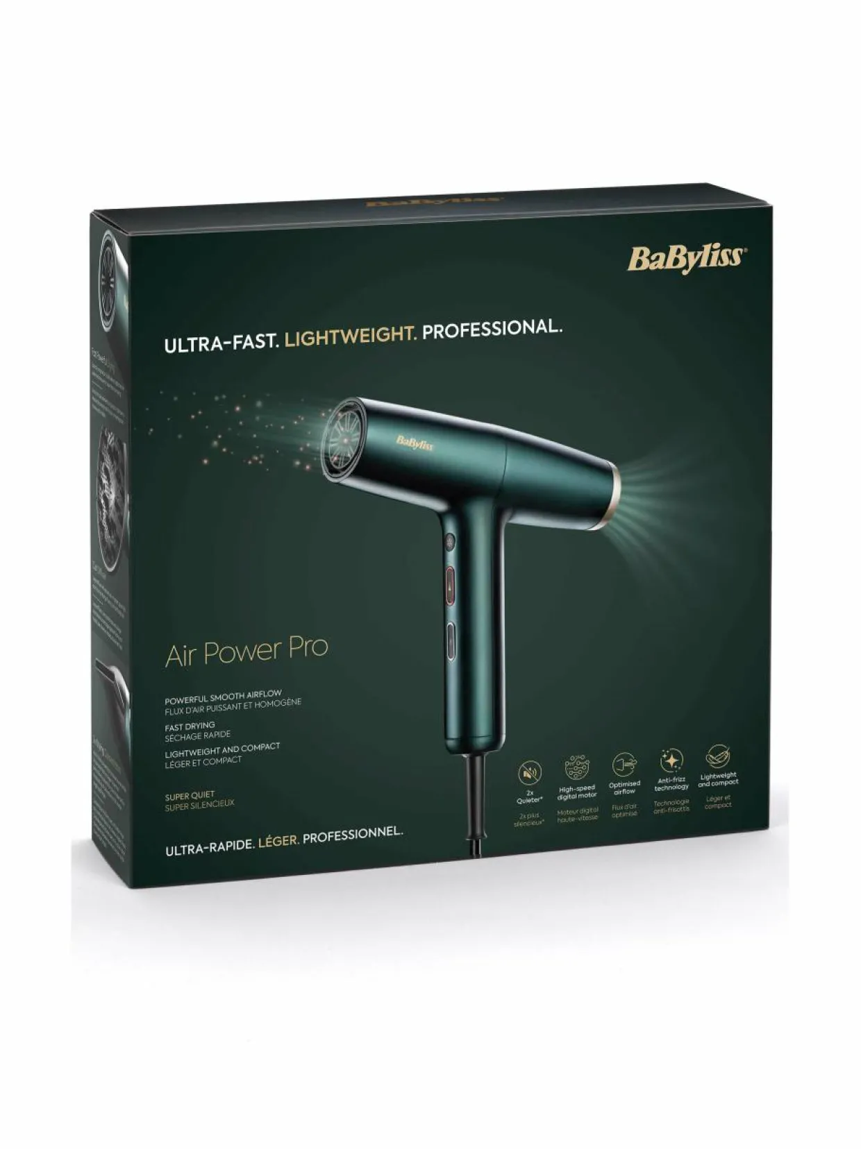 Kevyt, pitkäikäinen ja nopea digitaalinen moottori, joka on suunniteltu erittäin tehokkaaseen kuivaamiseen 200 km/h ilmannopeudella. Erittäin hiljainen Moottori ja puhallin on kalibroitu täydellisesti tasaisen ilmavirran sekä edistyneen melunvaimennuksen ja erittäin hiljaisen föönauksen takaamiseksi. Erittäin kevyt Vain 380 g – kevyin hiustenkuivaajamme. Erikoissuunniteltu helppokäyttöisyyttä ajatellen.- Nopea digitaalinen moottori Kevyt, pitkäikäinen ja nopea 1700 W:n digitaalimoottori tuottaa erittäin nopean 200 km/h ilmanopeuden.