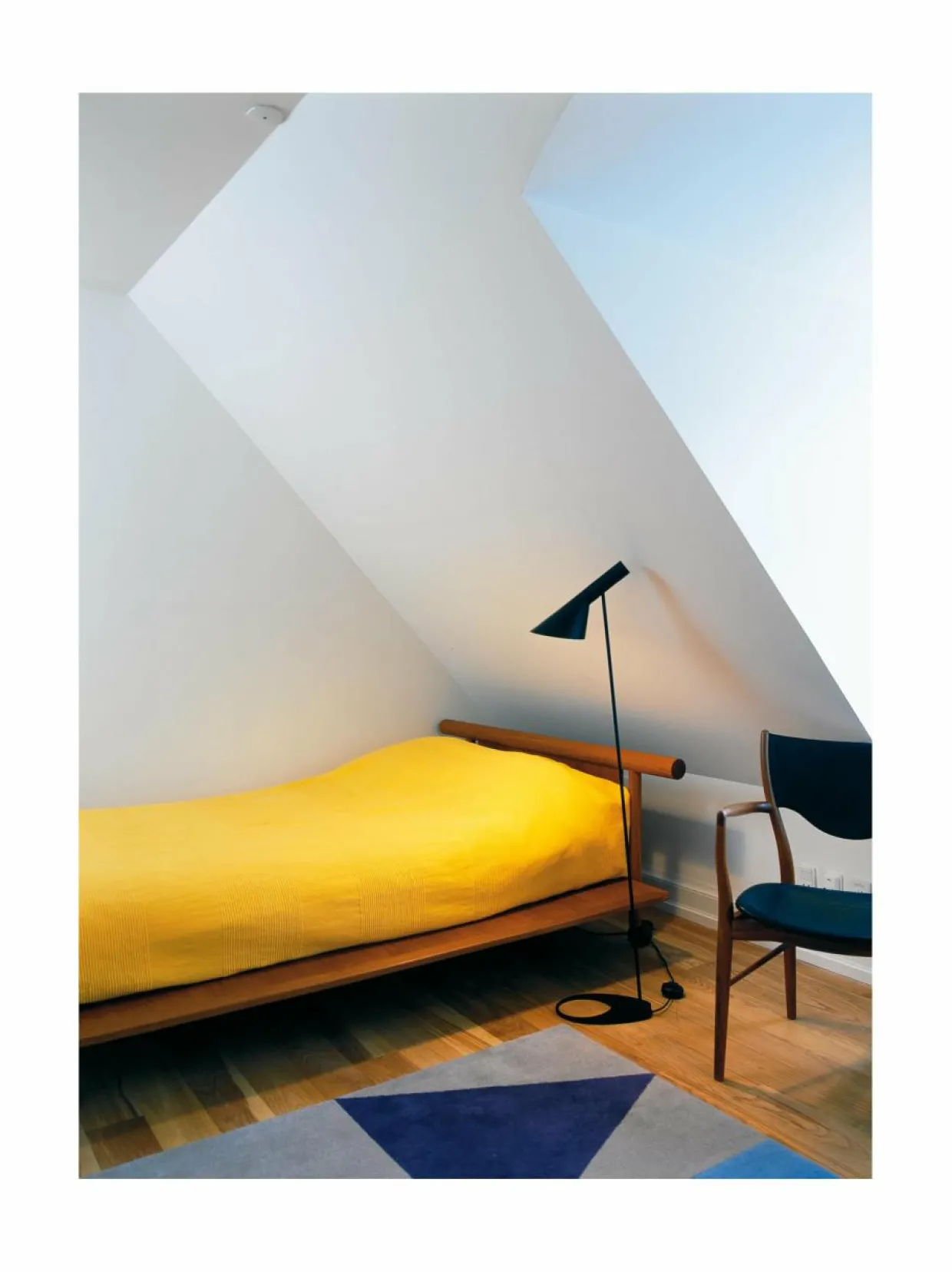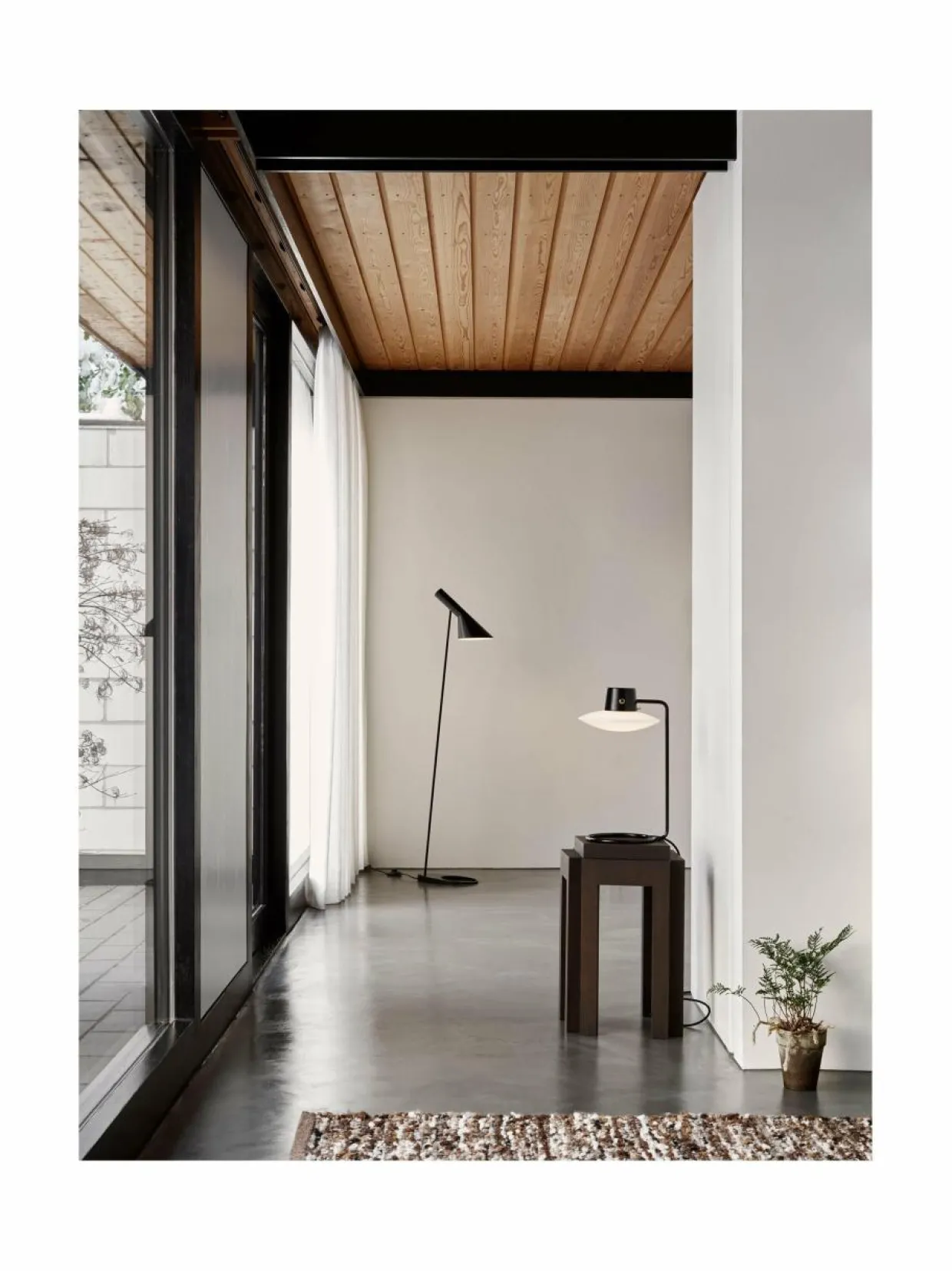 Arne Jacobsen suunnitteli yksinkertaisen tyylikkään AJ-valaisimen vuonna 1960 Kööpenhaminan Radisson SAS royal -hotelliin. Ajattoman muotokielensä ansiosta valaisin sopii hyvin monenlaiseen ympäristöön. Kallistuva varjostin voidaan säätää haluttuun asentoon ja kohdistaa valo juuri sinne, missä sitä tarvitaan. Valonlähde E27, 60W, A60. Korkeus on 130 cm, varjostimen pituus 32,5 cm, jalustan halkaisija 27,5 cm ja johdon pituus 2,6 m.