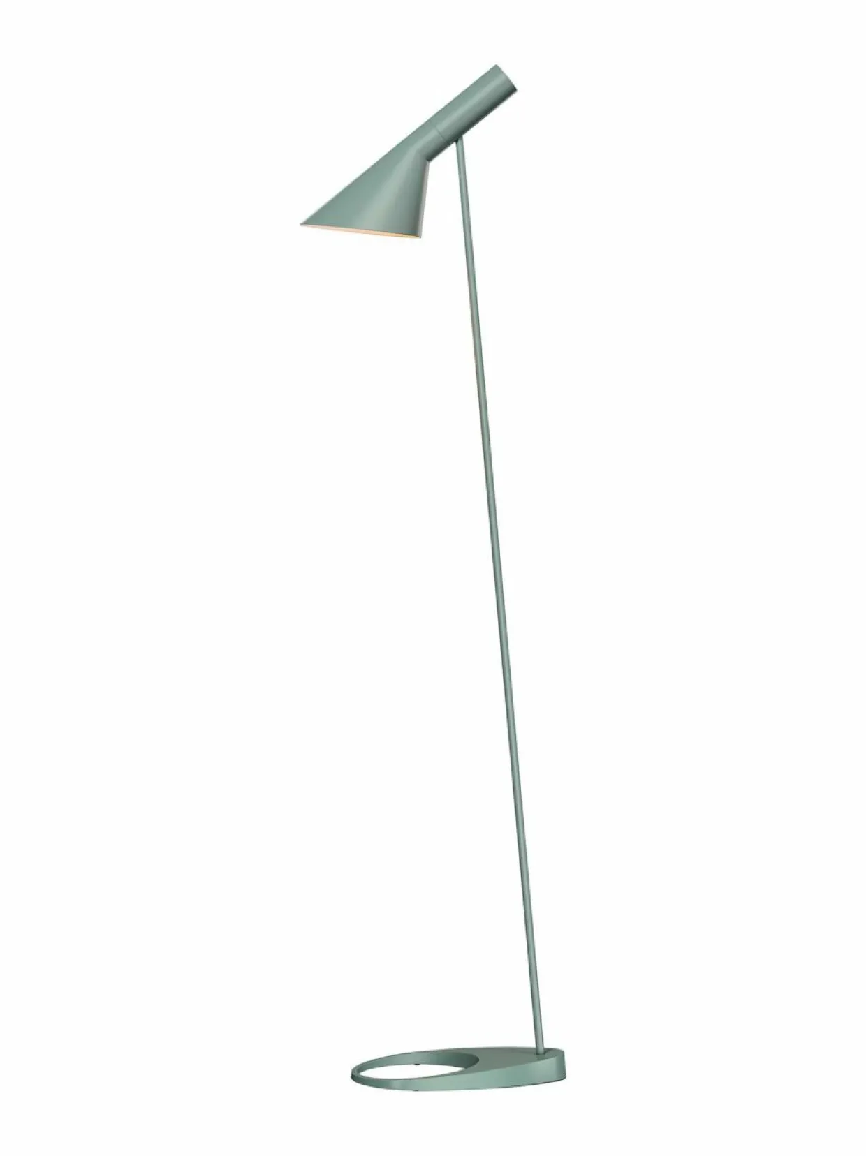 Arne Jacobsen suunnitteli yksinkertaisen tyylikkään AJ-valaisimen vuonna 1960 Kööpenhaminan Radisson SAS Royal -hotelliin. Ajattoman muotokielensä ansiosta valaisin sopii hyvin monenlaiseen ympäristöön. Kallistuva varjostin voidaan säätää haluttuun asentoon ja kohdistaa valo juuri sinne, missä sitä tarvitaan. Valaisimen korkeus on 130 cm, varjostimen pituus 32,5 cm ja jalustan halkaisija 27,5 cm. Sähköjohdon väri on musta.