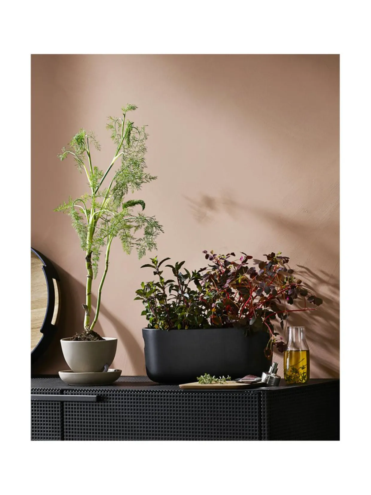 Eva Solon keraamisessa yrttilaatikossa on tilaa useammalle ruukulle, joten siihen saa koottua näyttävän kokonaisuuden erilaisia yrttejä niiden omissa ruukuissa. Yksinkertainen altakastelujärjestelmä perustuu kapillaari-ilmiöön ja sen avulla yrtit pystyvät ottamaan juuri tarvitsemansa määrän vettä 500 ml:n säiliöstä laatikon pohjalta. Näin kastelun tarve vähenee ja yrtit pysyvät elinvoimaisina, vaikka kukaan ei olisi muutamaan päivään kotona niistä huolehtimassa. Kädensijojen ansiosta laatikko on helppo siirtää esimerkiksi keittiöstä parvekkeelle ja takaisin. Soveltuu sekä sisä- että ulkokäyttöön, mutta vain lämpötilan ollessa plussan puolella. Kapillaariselle kankaalle suosittelemme käsinpesua haalealla vedellä, mutta kaikki muut osat voi pestä astianpesukoneessa.