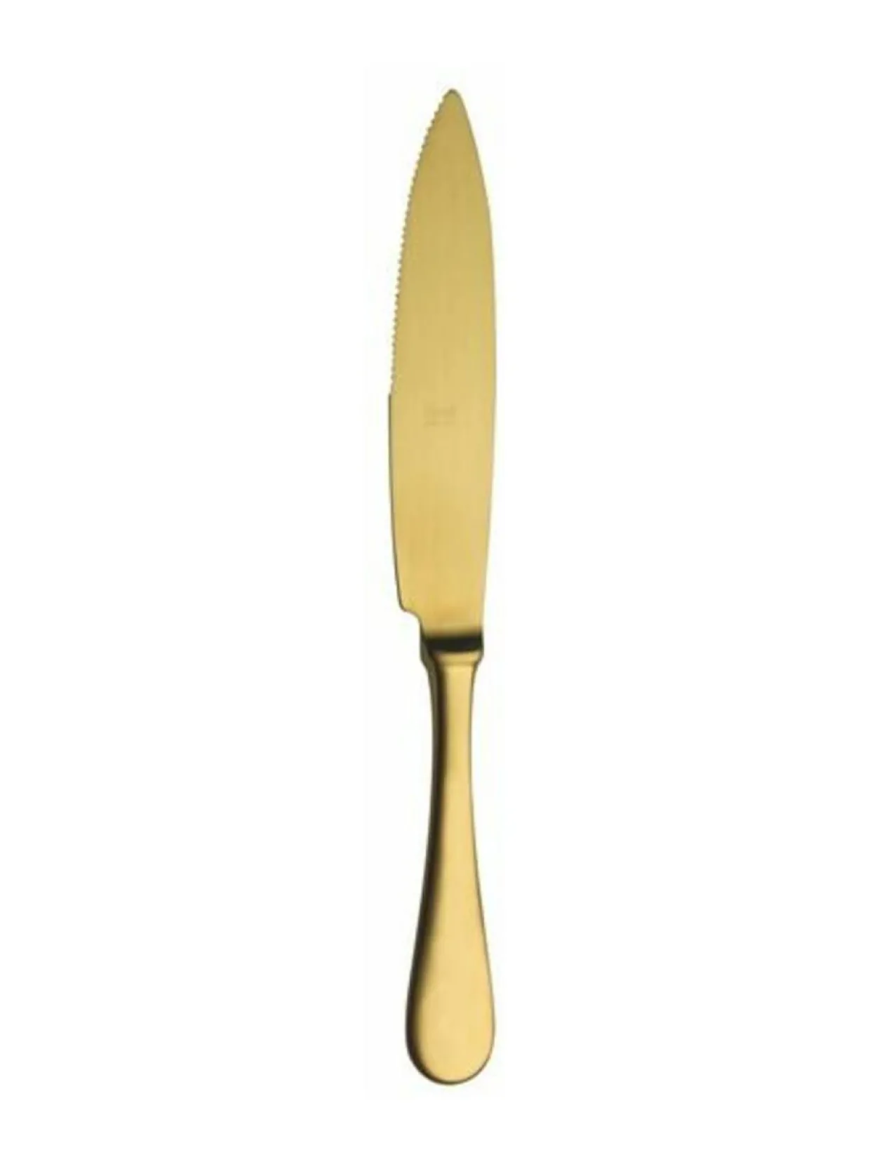 Mattakultainen Americano Oro Ice -pihviveitsi. Oro Ice (Matt Gold) erikoisväri ei ole pinnote, vaan se on PVD (Physical Vapor Deposit) -molekyyliimplantointiprosessin tulos. PVD -tuotteet ovat koneenpestäviä, ne eivät läikkiinny, eivätkä ne korrosioidu käytössä. Sahalaitaisen terävän ja ryhdikkään pihviveitsen pituus on 250 mm. Materiaali on konepestävää korkealaatuista suomalaista ruostumatonta terästä.