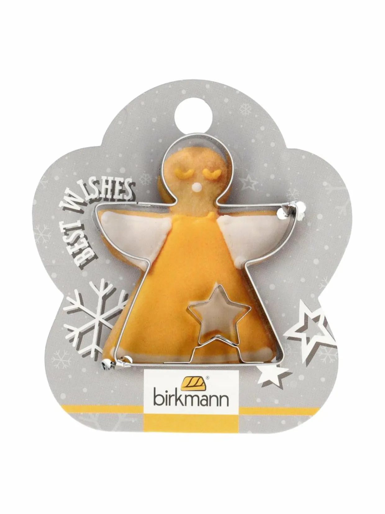 Birkmannin Angel Geometric -piparkakkumuotilla luot enkelin muotoisia pipareita. Muotin sisällä on pieni tähtimuotti, joka tekee enkelin helmaan tähden. Valmistettu ruostumattomasta teräksestä.