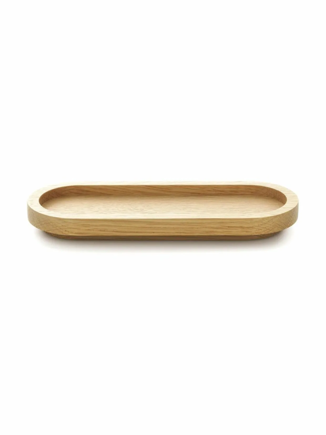 Lakatusta tammesta valmistettua pikkutarjotinta voi käyttää yksinään tai yhdistettynä saman sarjan muihin tarjottimiin. Tarjottimelle saat erinomaisesti esimerkiksi koruja tai muita pikkuesineitä, ja se on myös turvallinen ruoalle. Suunnittelija on Nestor Campos, 2016.
