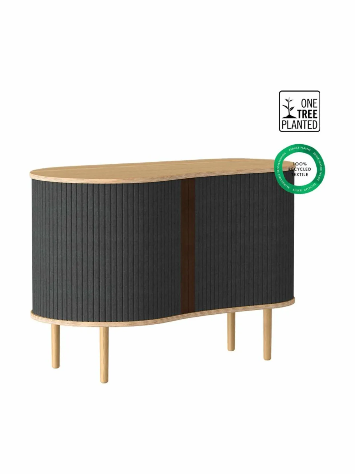 Tanskalaisen Umagen viilutetusta tammesta valmistettu Audacious on persoonallinen kaappi joka piilottaa tai korostaa. Kiertävä liukuovi määrittää miten paljon haluat näyttää kaapin sisältöä. Kauniisti aaltoilevan kaapin sisällä on pohjan lisäksi yksi hyllytaso. Kankainen liukuovi on vaihdettava: jos haluat uutta väriä voit vaihtaa pelkän rulo-oven.