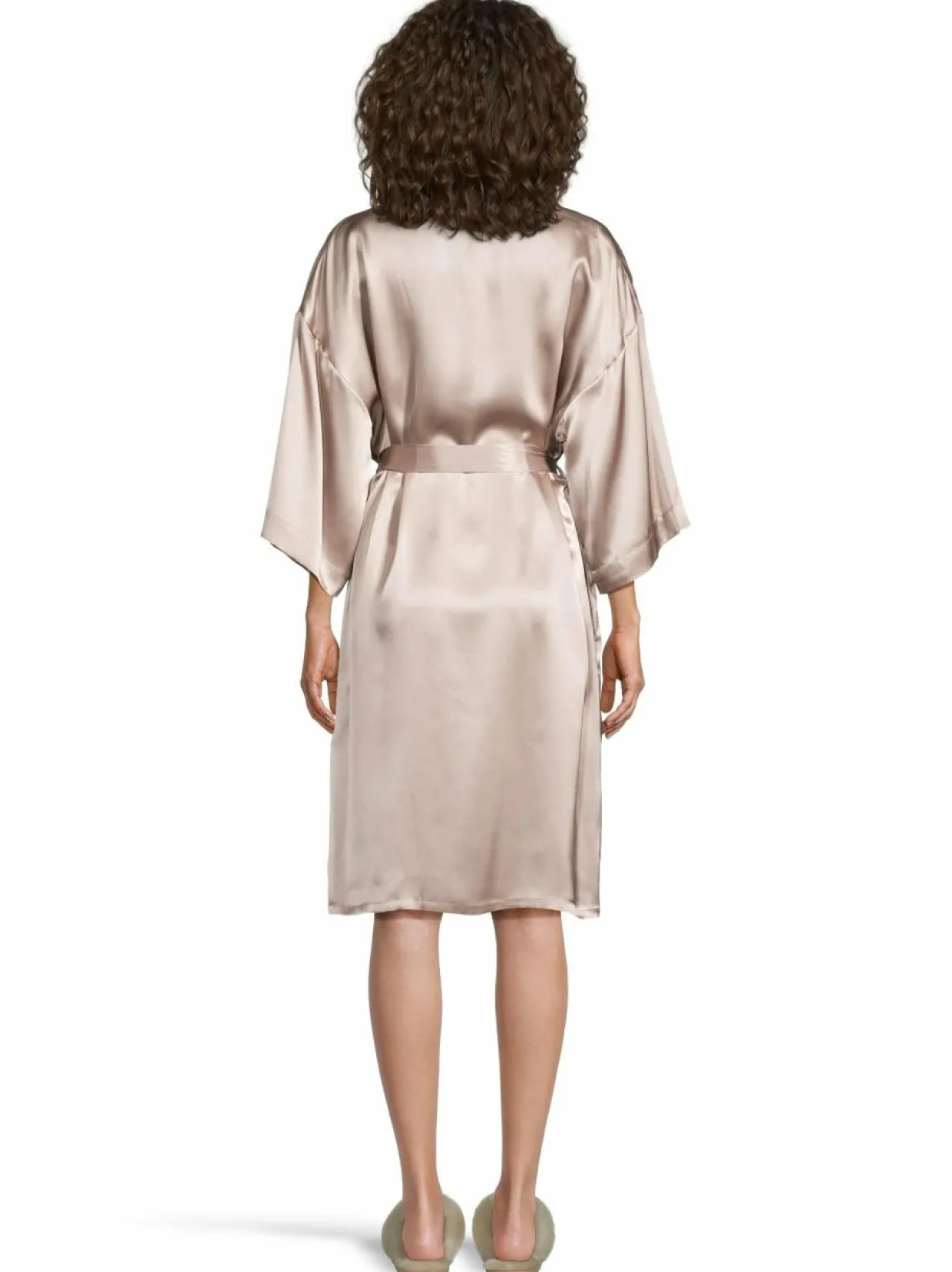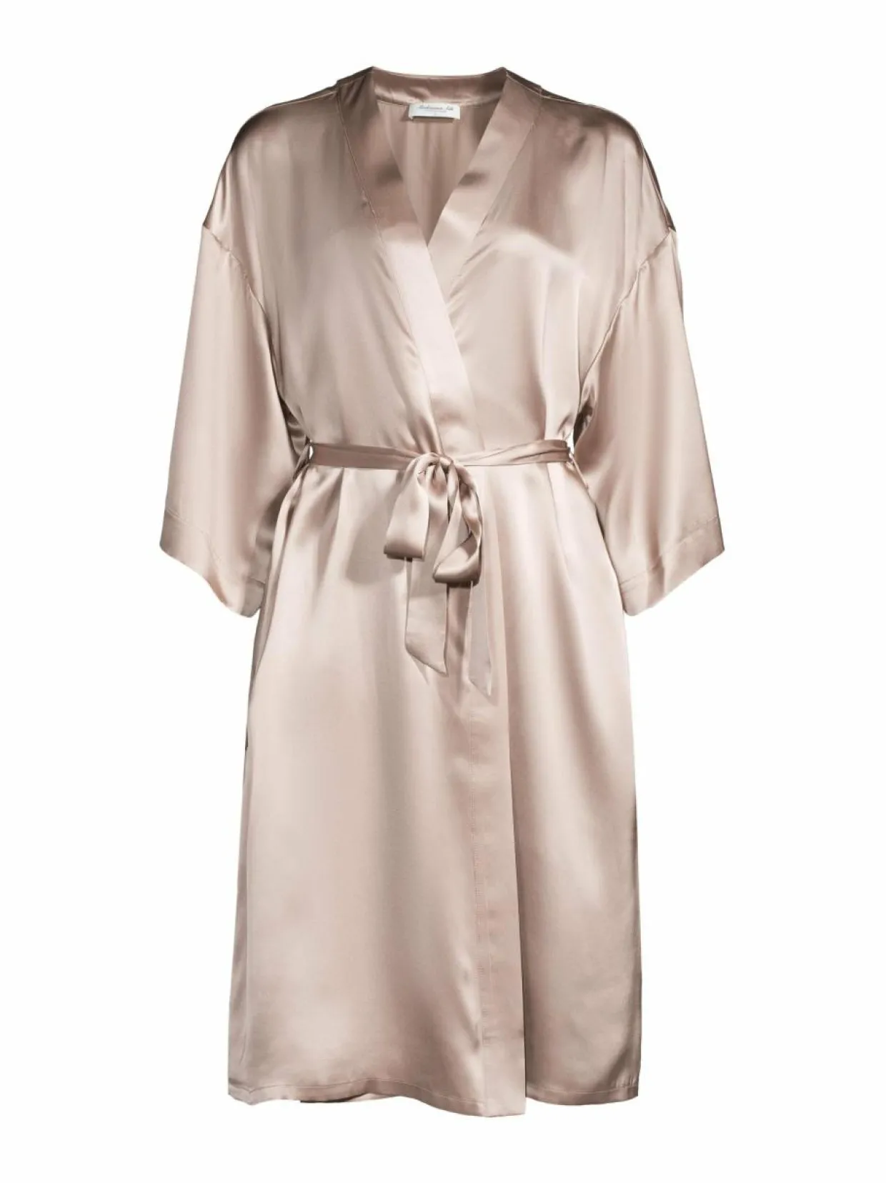 Audrey-aamutakki on kevyttä ja ylellisen tuntuista silkkiä. Aamutakissa on madalletut olkapäät ja solmittava vyö. Tuote myydään lahjapakkauksessa.