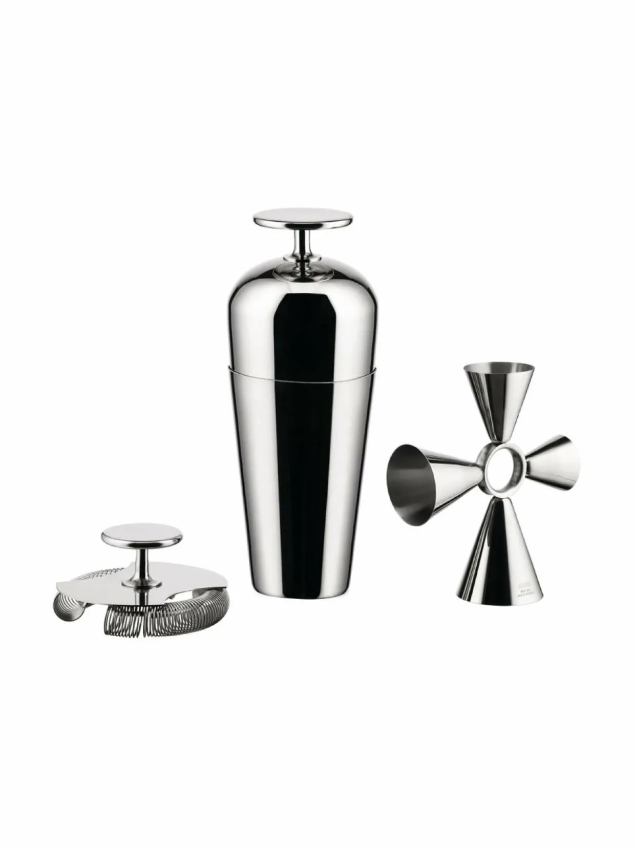 Upea Alessin baarisetti on valmistettu ruostumattomasta teräksestä. Siihen kuuluu cocktailsiivilä, shaker sekä mittakupit. Baarisetti tuo hohtoa niin arki-iltoihin kuin juhlahetkiin ja se sopii erinomaisesti myös lahjaksi.
