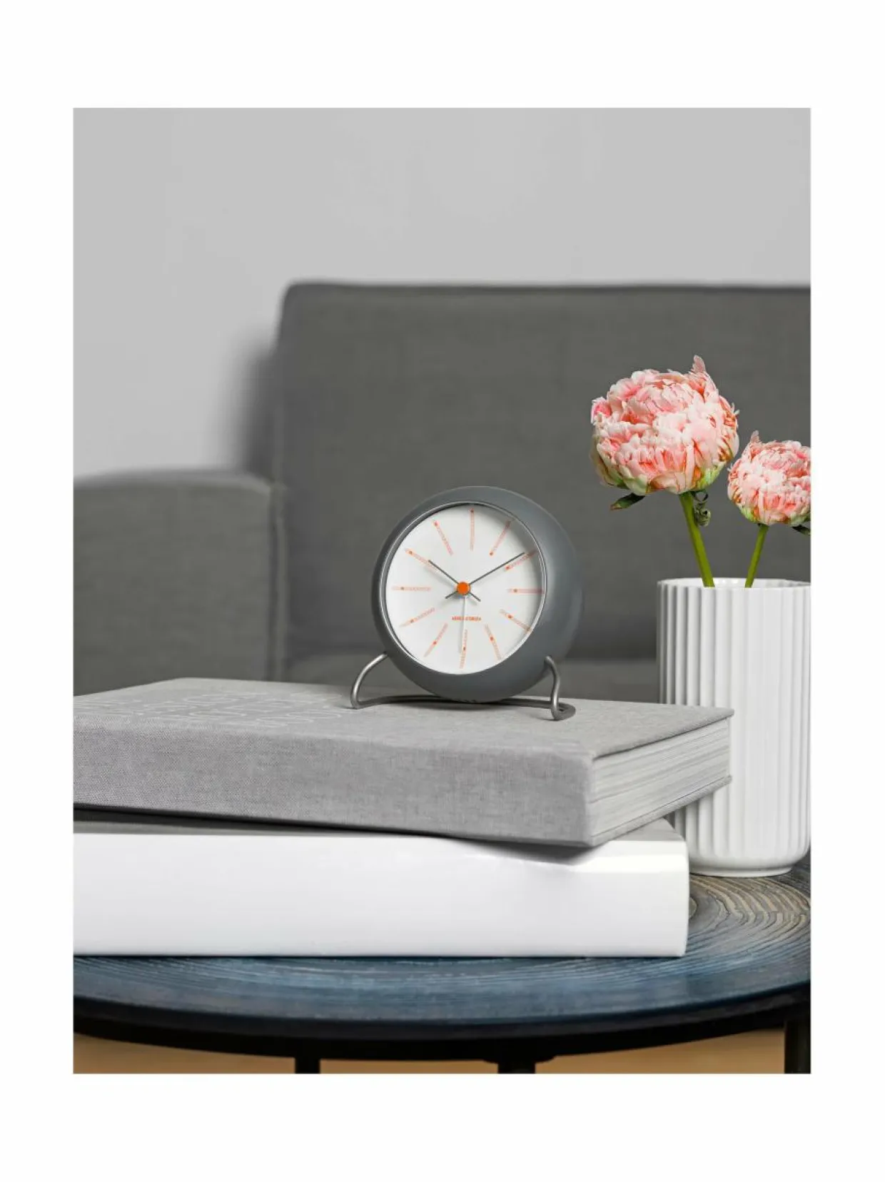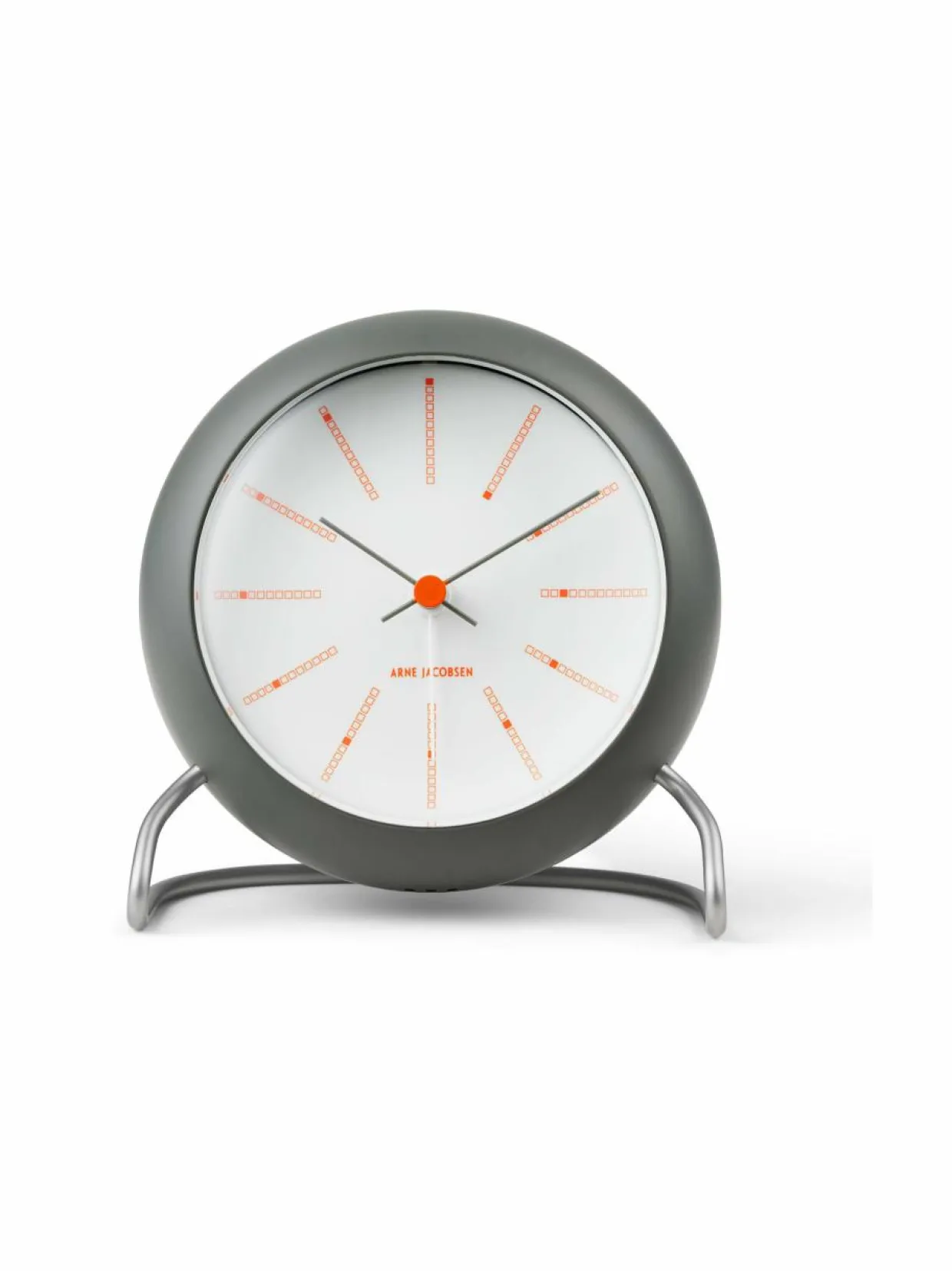 Arne Jacobsenin AJ Bankers -pöytäkello herätystoiminnolla on valmistettu karkaistusta iskunkestävästä lasista, jossa on vankka jalusta ruostumatonta terästä. Tämä malli on päivitetty versio elegantista pöytäkellosta, jonka tanskalaisarkkitehti piirsi vuonna 1939. Linjakkaat metallijalat viittaavat Jacobsenin ikonisiin tuolimalleihin, ja graafinen kellotaulu on lainattu kellomallista, jonka hän suunnitteli osaksi Tanskan kansallispankin sisustusta vuonna 1971. Uutta ovat torkkutoiminto ja valosensori. AJ Bankers -pöytäkello on koristeellinen ja minimalistinen elementti sisustuksessasi. Paristo 2 kpl AA – ei sisälly.