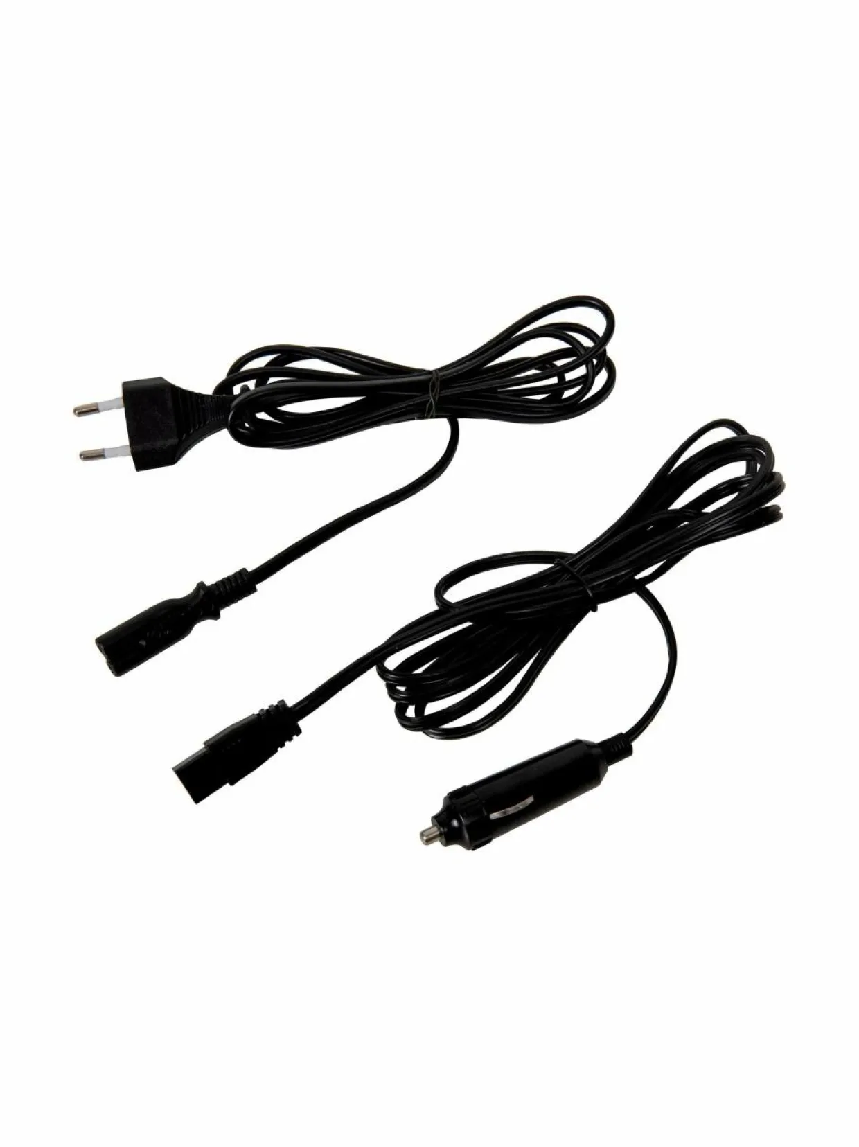 - Mukana auton virtajohto 12 V, pituus 2 m. Verkkovirtajohto AC 230 V, pituus 1,8 m. Johtot irtonaisina pakkauksessa.