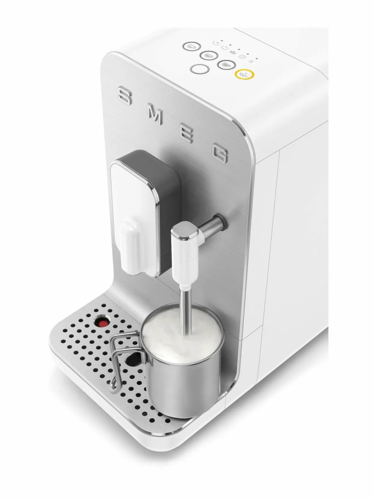Smeg BCC12BLMEU on täysautomaattinen espresso-kahvikone, joka yhdistää tyylikkään muotoilun ja huipputeknologian tarjotakseen erinomaisen kahvikokemuksen. Kompaktiin muotoiluun pakattu, vain 18 cm leveä, 43,3 cm syvä ja 33,6 cm korkea, laite sopii täydellisesti jokaiseen keittiöön. Sen Thermoblock-lämmitysjärjestelmä ja 19 barin pumpunpaine takaavat ammattimaisen kahvinvalmistuksen, kun taas sisäänrakennettu mylly jauhaa pavut täydellisesti. Voit säätää kahvinjauhatuksen oman makusi mukaan pavulle sopivaksi. Kahvin valmistus on vaivatonta sen 4 painikkeen ja säädettävien asetusten ansiosta, mahdollistaen monipuoliset kahvijuomat mieltymystesi mukaan. Valmistat laitteella helposti niin ristreton, espresson, normaalin kahvin, kuin myös herkulliset maitokahvit kuten cappuccinon ja laten. Maidon vaahdotusputkella vaahdotan maidon helposti kahvinvalmistuksen yhteydessä tai voit myös ottaa siitä kupillisen kuumaa vettä esimerkiksi teen valmistukseen. Lisäksi 1,4 litran vesisäiliö ja 150 gramman kahvipapusäiliö tekevät useamman kupillisen valmistamisesta helppoa.