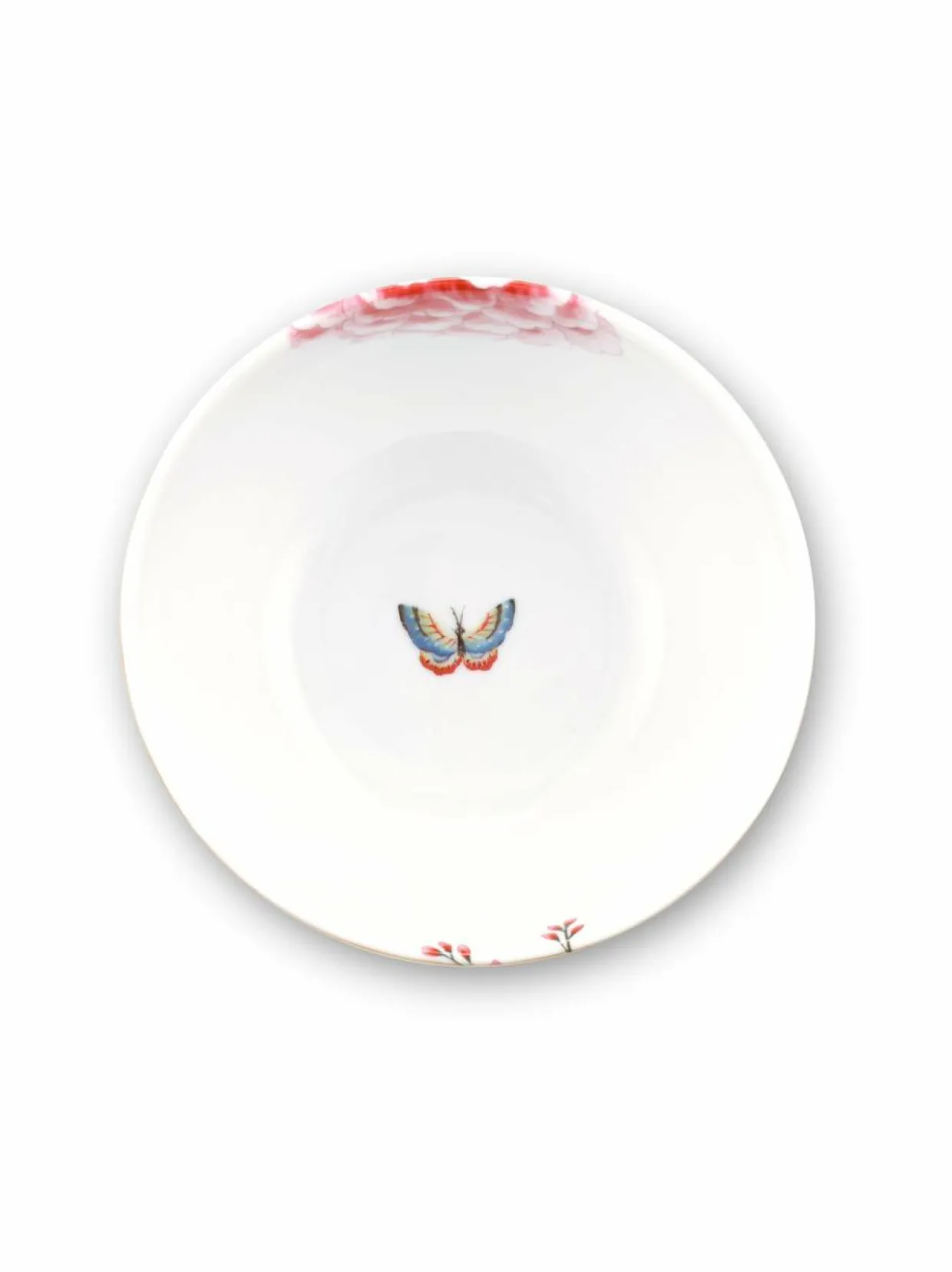 PiP Studion Blushing Birds -astiasarjaan on maalattu eksoottisia lintuja ja kauniita kukkia. Materiaali on korkealaatuista posliinia. Kuviointien vuoksi osat tulee pestä käsin. Astiat eivät kestä kuumennusta mikroaaltouunissa.